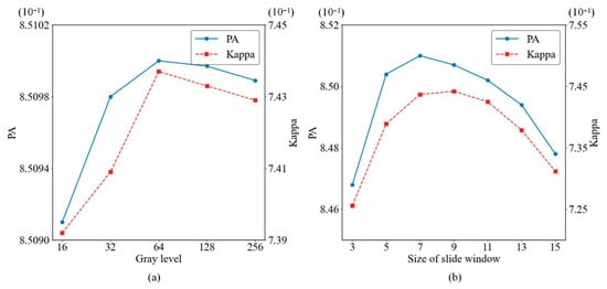 Comparison of GLCM parameter settings: sliding window size and gray-level configuration. The left ordinate indicates the producer accuracy (PA), while the right ordinate displays the corresponding kappa coefficient. Panel (a) illustrates these trends of PA and kappa coefficients for a given texture feature across varying gray-level settings, whereas panel (b) depicts the different trends of sliding window sizes.