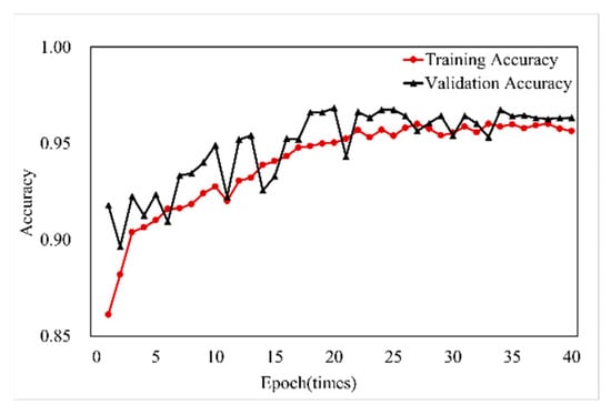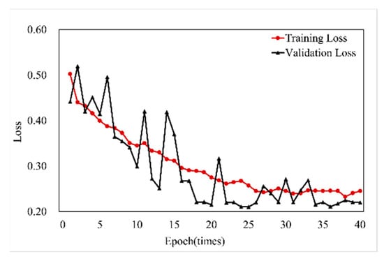 Figure 6 and Figure 7 illustrate the convergence of the loss function and the changes in recognition accuracy for one iteration of the leave-one-site-out validation, where the samples from site (a) were used as the validation set and those from sites (b)–(j) were used for training. For the remaining nine iterations, the models similarly stabilized after approximately 35 epochs. As illustrated, the classification accuracy of the network tends to improve as the number of iterations increases. During the validation process, the accuracy curve fluctuated greatly in the early stage but eventually stabilized at approximately 97%. The loss function curve follows a trend opposite to the accuracy curve, while the loss function value gradually decreases and stabilizes at approximately 0.25. Ultimately, the validation accuracy of the model is greater than the training accuracy, and the validation loss value is lower than the training loss value. The improvement in performance on the validation set is evident, indicating that the proposed network demonstrates fairly dependable generalization capabilities.