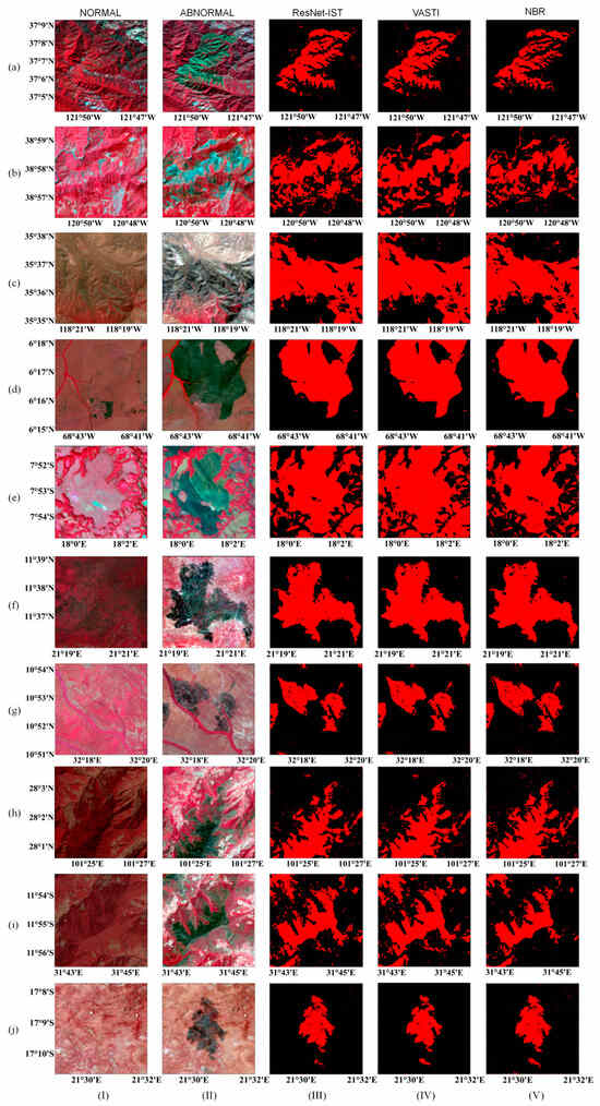 Mapping of the study areas in normal and abnormal situations visual results of VASTI, ResNet-IST, and NBR. (a–j) represent the labels of the ten study sites. Column (I) shows the false-color remote sensing images of the validation areas before the fire, while Column (II) presents the false-color images after the fire. Columns (III), (IV), and (V) display the burned area extraction results obtained by the ResNet-IST model, the VASTI index, and the NBR index, respectively.