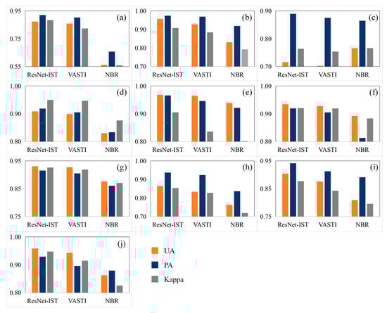 Statistical maps of the UA, PA, and kappa coefficient of the three models for extracting vegetation anomaly regions. (a–j) illustrate the extraction accuracy maps of burned anomaly areas in the ten validation regions obtained using the ResNet-IST, VASTI, and NBR models, respectively.