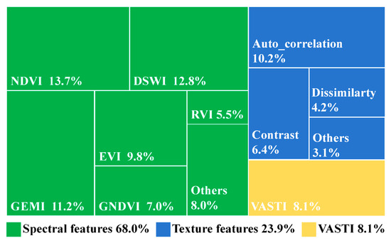 The results indicate that SFs dominate the model, collectively accounting for 68.0% of the total contribution. Among them, NDVI, DSWI, and GEMI exhibit the highest contributions, consistent with their widespread application in assessing vegetation health, making them particularly responsive to burned vegetation. The nine TFs contribute 23.9% to the model, serving as auxiliary information. Among these, autocorrelation ranked first, followed by contrast and dissimilarity. The remaining six TFs make relatively minor contributions, collectively accounting for only 3.1%. Notably, the integrated VASTI contributes only 8.1% to the model, lower than certain individual spectral and texture features. This lower contribution may be attributed to feature redundancy, as VASTI inherently incorporates multiple VIs and TFs. Otherwise, composite features involve multiple component parameters, which may lead to gradient direction conflicts during backpropagation. This can result in unstable weight updates within the model, ultimately causing the contribution of composite features to be significantly weaker than that of individual dominant features [78]. However, this explanation remains tentative and would require further experimental validation before being confirmed.