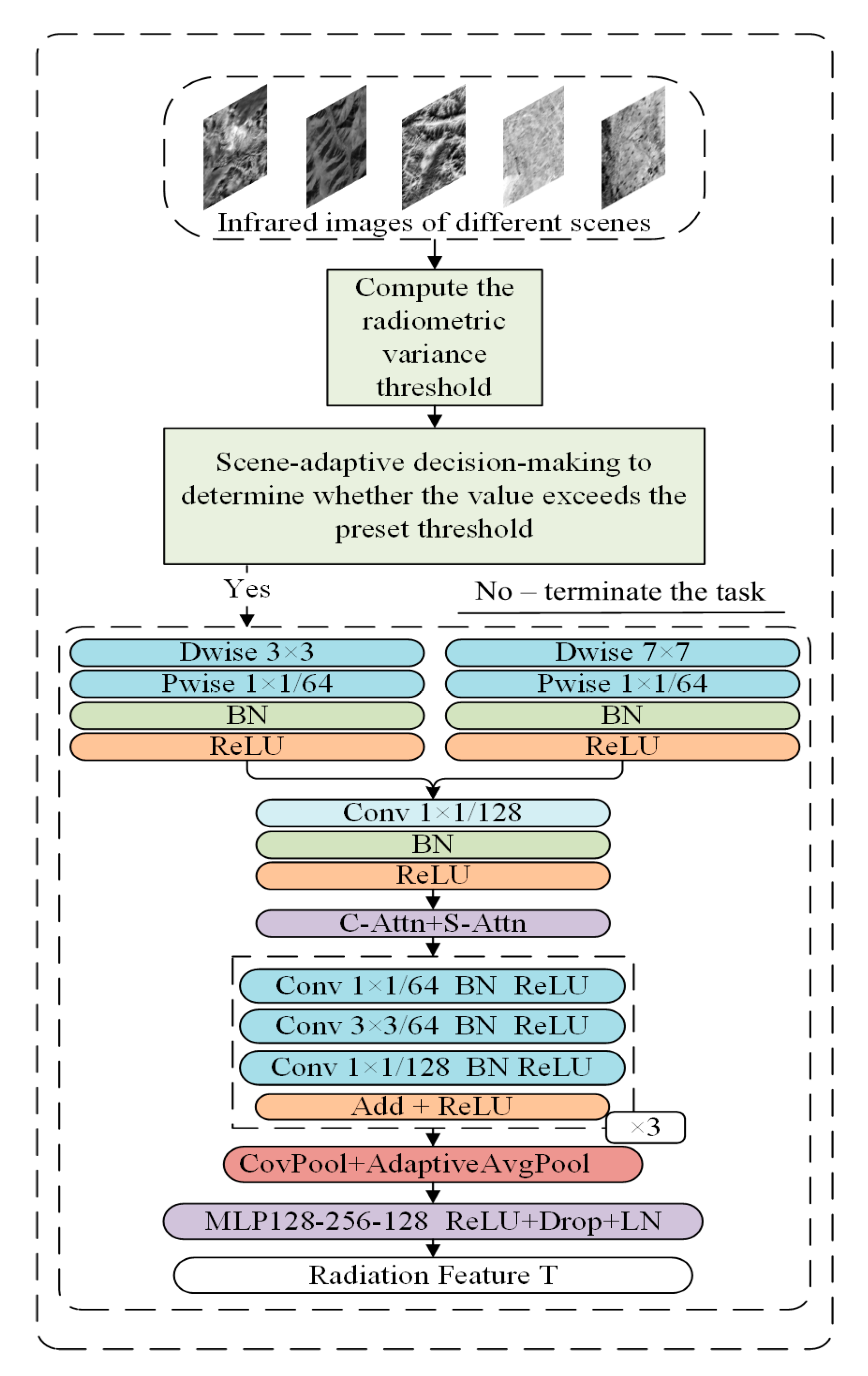 When the variance of the infrared image is small, it indicates a uniform radiation field distribution, and differences between radiation features are minimal, making them difficult to distinguish. Therefore, the step of extracting radiation characteristics is skipped. High variance implies significant differences in radiation intensity across the image, corresponding to well-defined edges and structures. During feature extraction, the model uses 7 × 7 and 3 × 3 depthwise-separable convolutional kernels for multi-scale convolution, to capture edge, texture, and long-range radiation features. Adopting a larger receptive field facilitates the integration of neighborhood information, enabling robust estimation of overall radiation distribution in the initial processing stage. Then the two feature maps are combined by a 1 × 1 convolution to produce an output of 128 channels. After normalization and ReLU activation, a channel-wise and spatial attention mechanism refines radiation-related information while suppressing background noise. Nonlinear representation enhancement is performed using a residual bottleneck. Adaptive average pooling and covariance pooling are then applied to generate features, where the latter employs a covariance matrix to preserve the correlation structure of radiation distribution while enhancing the representation of radiation characteristics for objects such as the Gobi, deserts, and rock formations. Finally, the MLP bottleneck (including ReLU, Dropout, and LayerNorm) performs nonlinear transformation and regularization, outputting the global radiation feature vector T, which is fed into downstream stages to highlight structural dissimilarities. In other scenes, radiation characteristics are not introduced, thereby effectively mapping infrared physical properties to a common representation space aligned with visible light features. This mitigates modal differences and ultimately achieves compact physical perception feature encoding through multi-stage transformations.