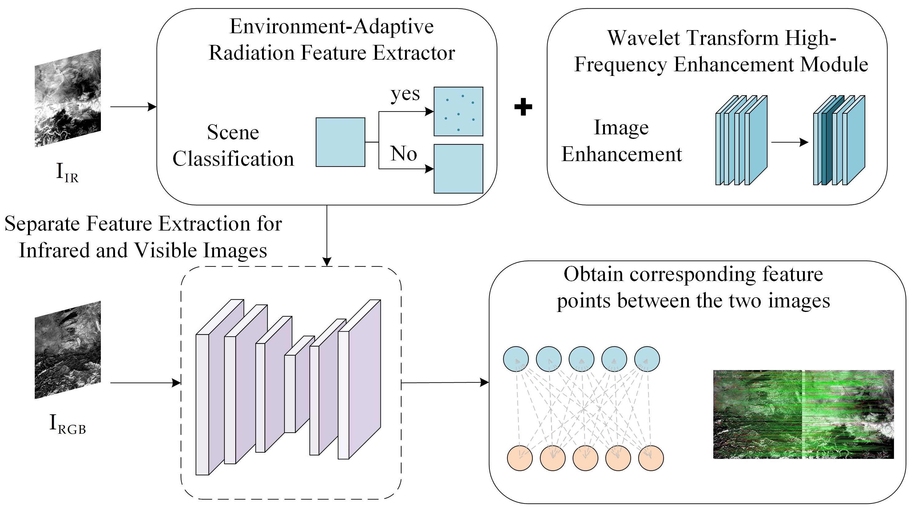 32]. To mitigate cross-modal gap, we isolate parameters by embedding the Environment-Adaptive Radiation Feature Extractor and the Wavelet Transform High-Frequency Enhancement Module into the infrared pathway. Each residual block is tagged with its modality, allowing convolutions to learn modality-specific kernels, sharpen edges, and boost target saliency. Infrared images are processed by the Wavelet Transform High-Frequency Enhancement Module and, in parallel, fed into the Environment-Adaptive Radiation Feature Extractor for selective radiation encoding. The infrared branch thus yields an aggregated radiation representation. Finally, both modalities are fused within the pipeline for joint feature extraction, followed by coarse-to-fine matching.