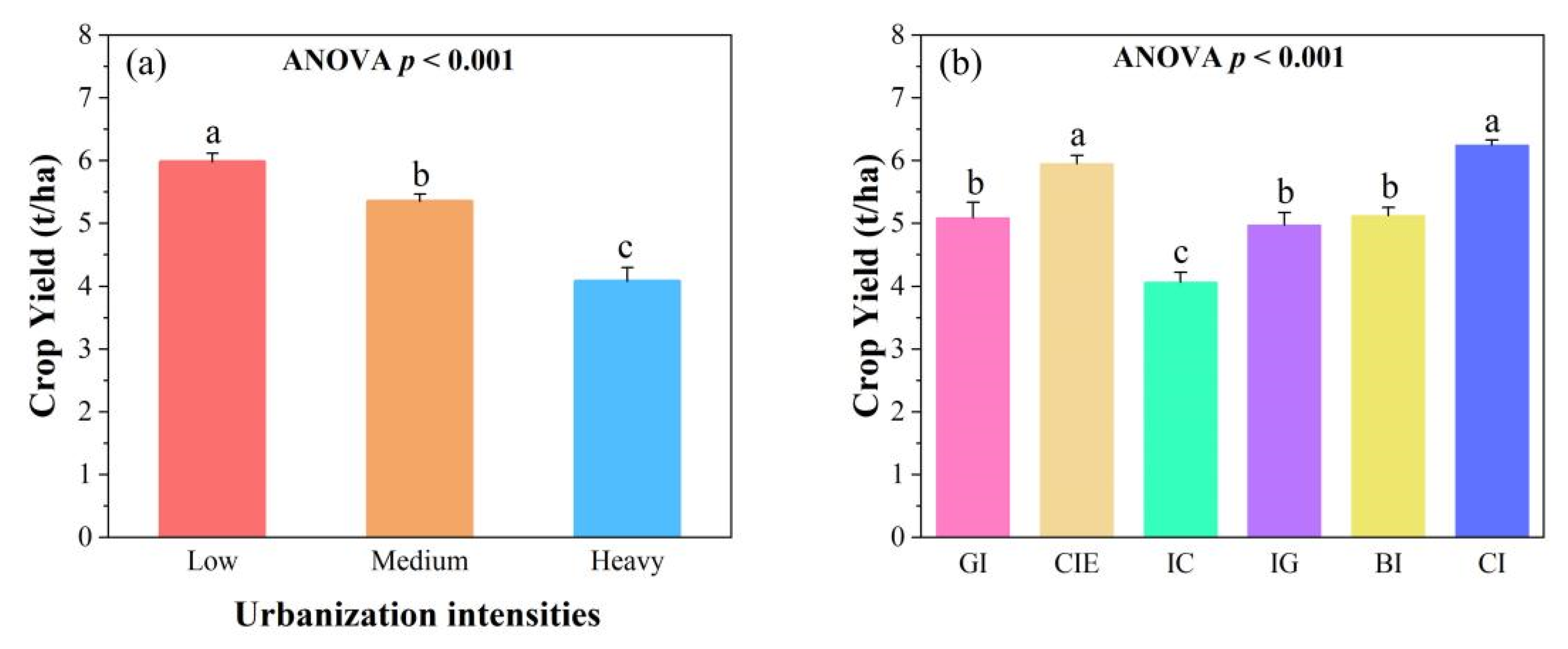 - We found that crop yield declined continuously with increasing urbanization intensity. The crop yield under low urbanization was 46.5% higher than that under heavy urbanization. Within heterogeneous agricultural landscapes, impervious surface-cropland landscape dominated by cropland landscapes (CI) landscapes have the highest crop yield at 6.25 t/ha, whereas impervious surface-cropland landscapes dominated by impervious surface landscapes (IC) have the lowest crop yield at 4.06 t/ha, and that of impervious surface-cropland landscapes with cropland-impervious surface equilibrium landscapes (CIE) is 5.95 t/ha.