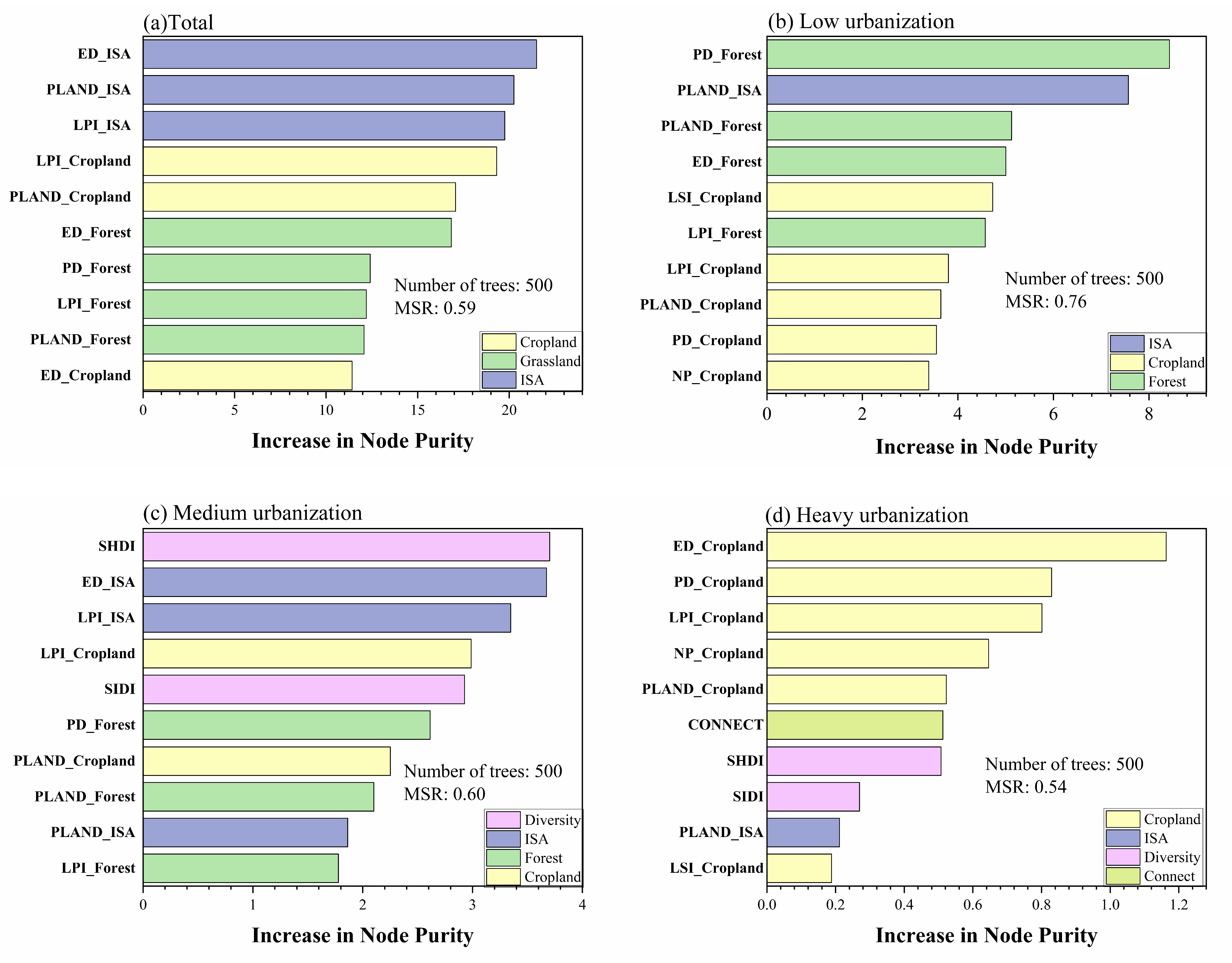 - The main factors of landscape patterns and diversity that influence crop yield differ with different urbanization intensities. Overall, edge density ED, proportion, and largest patch index of the impervious surface were the main factors influencing crop yield, where the threshold for ED_ISA = 200 m/ha. In low-urbanization areas, forest patch density, forest proportion, and impervious surface proportion were important drivers, and the threshold for PD_forest = 40 patches/ha. Under medium urbanization, Shannon’s diversity indices, impervious surface edge density, and largest impervious surface patch index were important factors influencing crop yield. During heavy urbanization, the patch density, edge density, and largest cropland patch index of cropland are important factors. This indicates that the control landscape indicators of croplands, forests, and impervious surface can effectively influence cropland productivity.