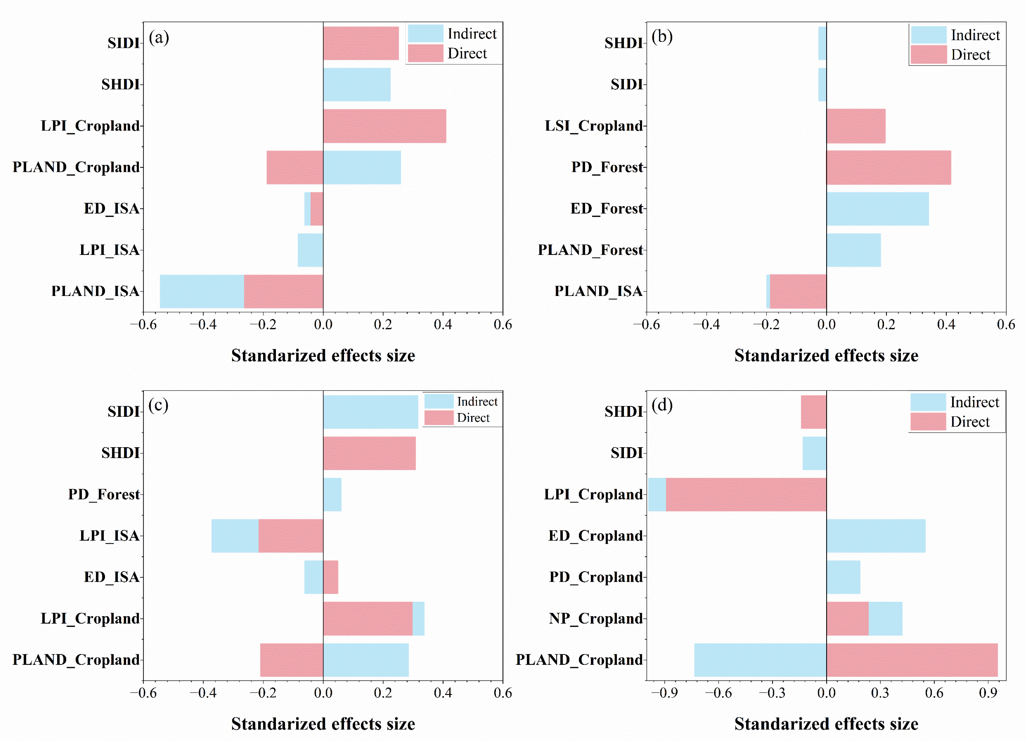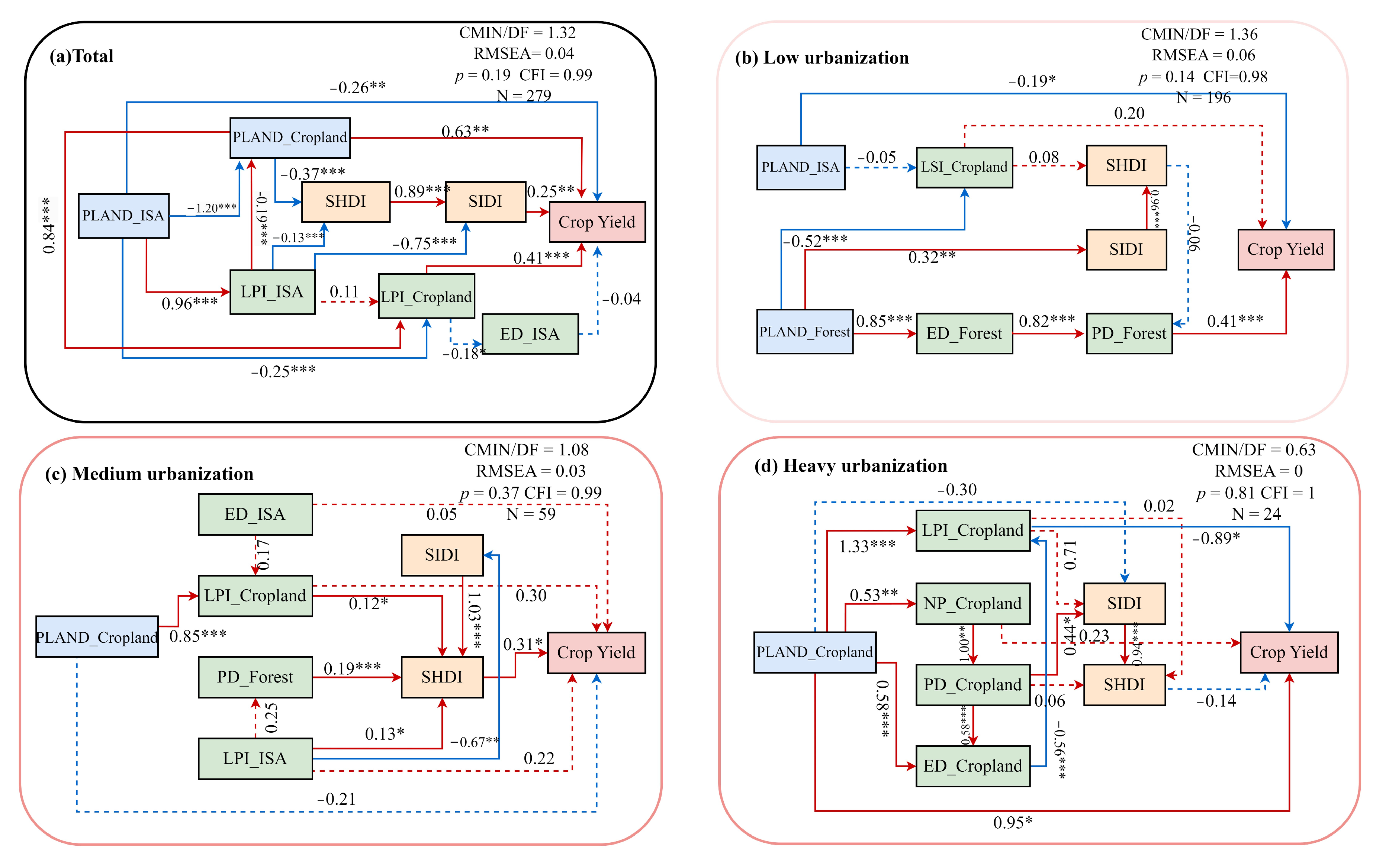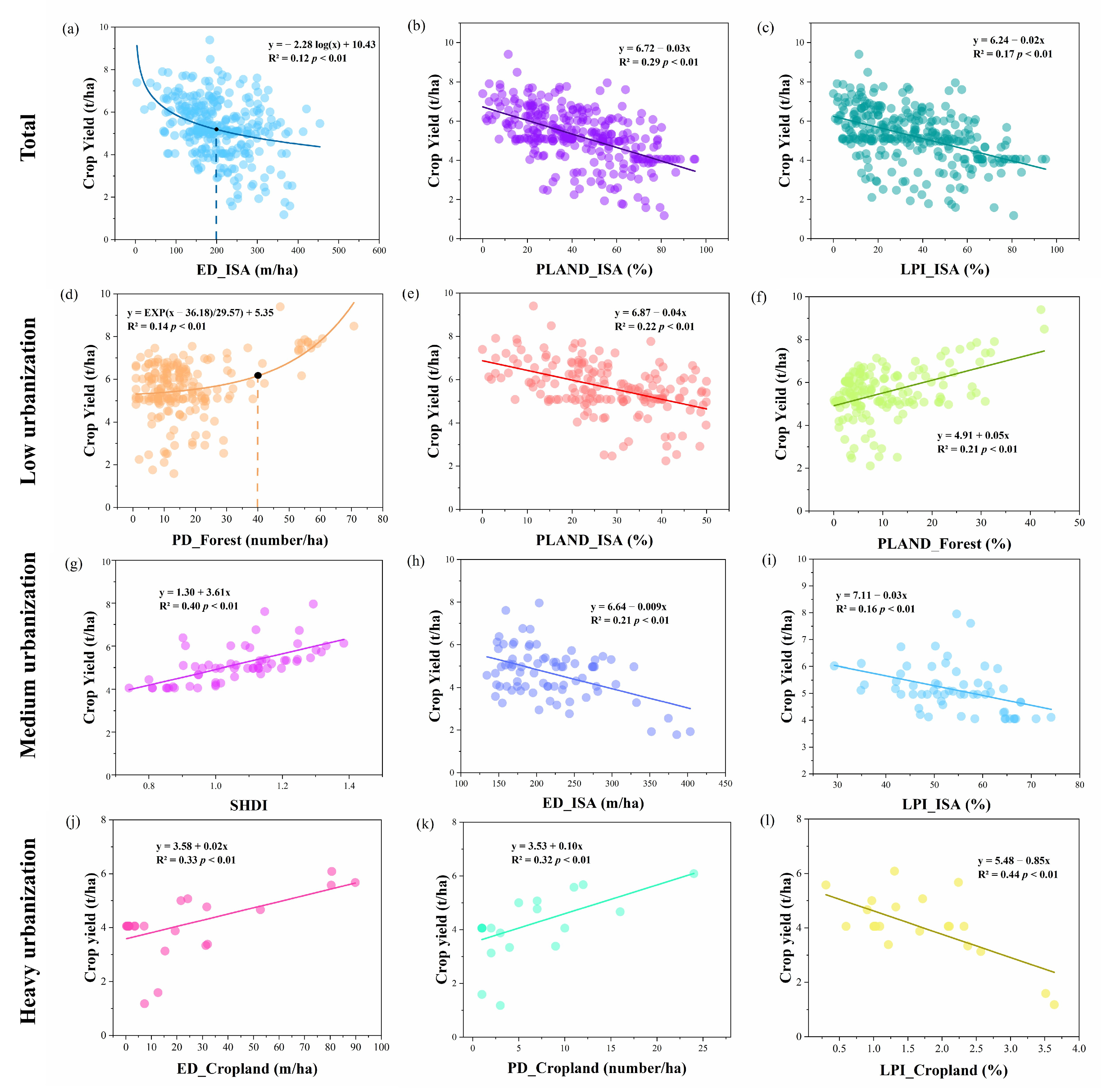 - We found that crop yield was mainly affected by the landscape composition and configuration of croplands and impervious surface. The crop yield effect mechanisms of the driving factors at different urbanization intensities are complex. In low-urbanization areas, forest proportion indirectly enhanced crop yield through forest edge density and forest patch density. Under moderate urbanization, cropland proportion positively influenced crop yield by enhancing largest cropland patch index and Shannon’s diversity indices. Finally, under heavy urbanization, cropland proportion was directly positively correlated with crop yield and indirectly affected crop yield through largest cropland patch index and cropland edge density. Limiting impervious surface and their irregular shapes as well as increasing vegetation cover to alleviate cropland fragmentation can help sustain crop yields and mitigate the negative impacts of urbanization.