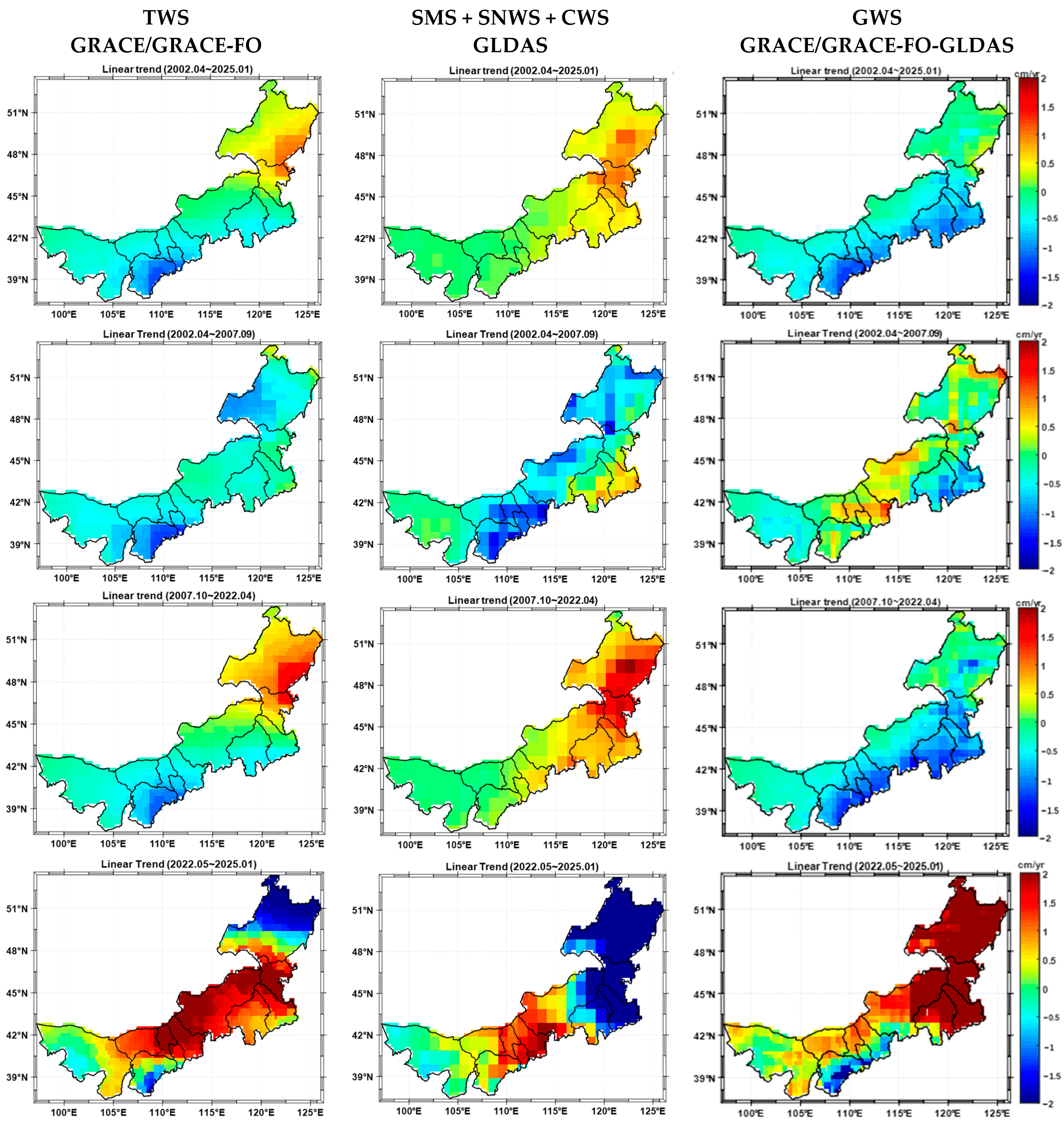 3.1. Spatiotemporal Analysis of Water Storage Changes in Inner Mongolia