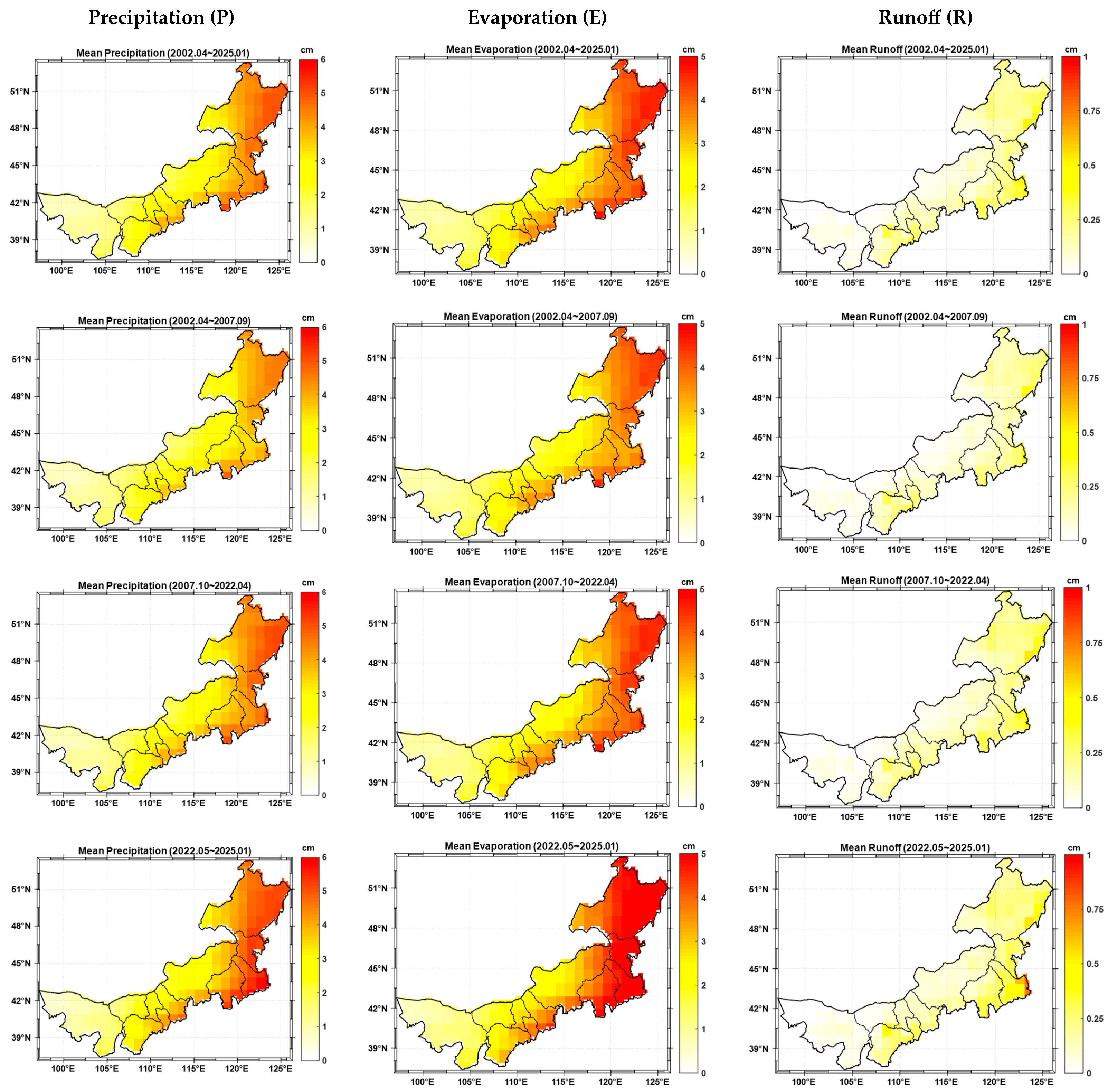 | Hulun Buir | TWS (GRACE/GRACE-FO) | [3.01 ± 3.56] [129.7 ± 78.2] | [3.46 ± 3.56] [136.0 ± 19.5] | 5.09 ± 3.69 |