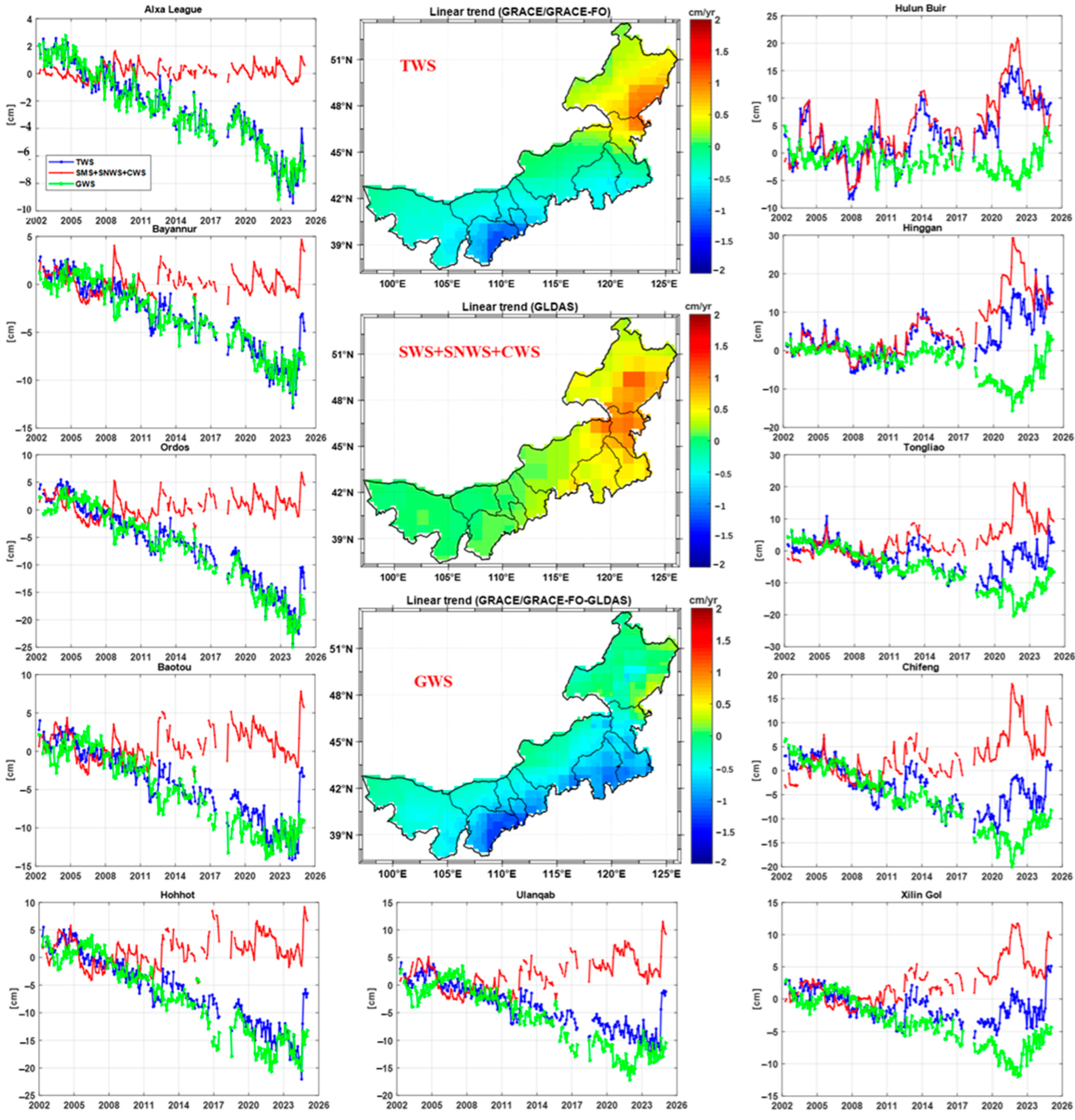 | Bayannur | TWS (GRACE/GRACE-FO) | [1.10 ± 1.25] [217.5 ± 62.5] | [2.15 ± 1.25] [76.6 ± 33.4] | −4.80 ± 0.13 |
