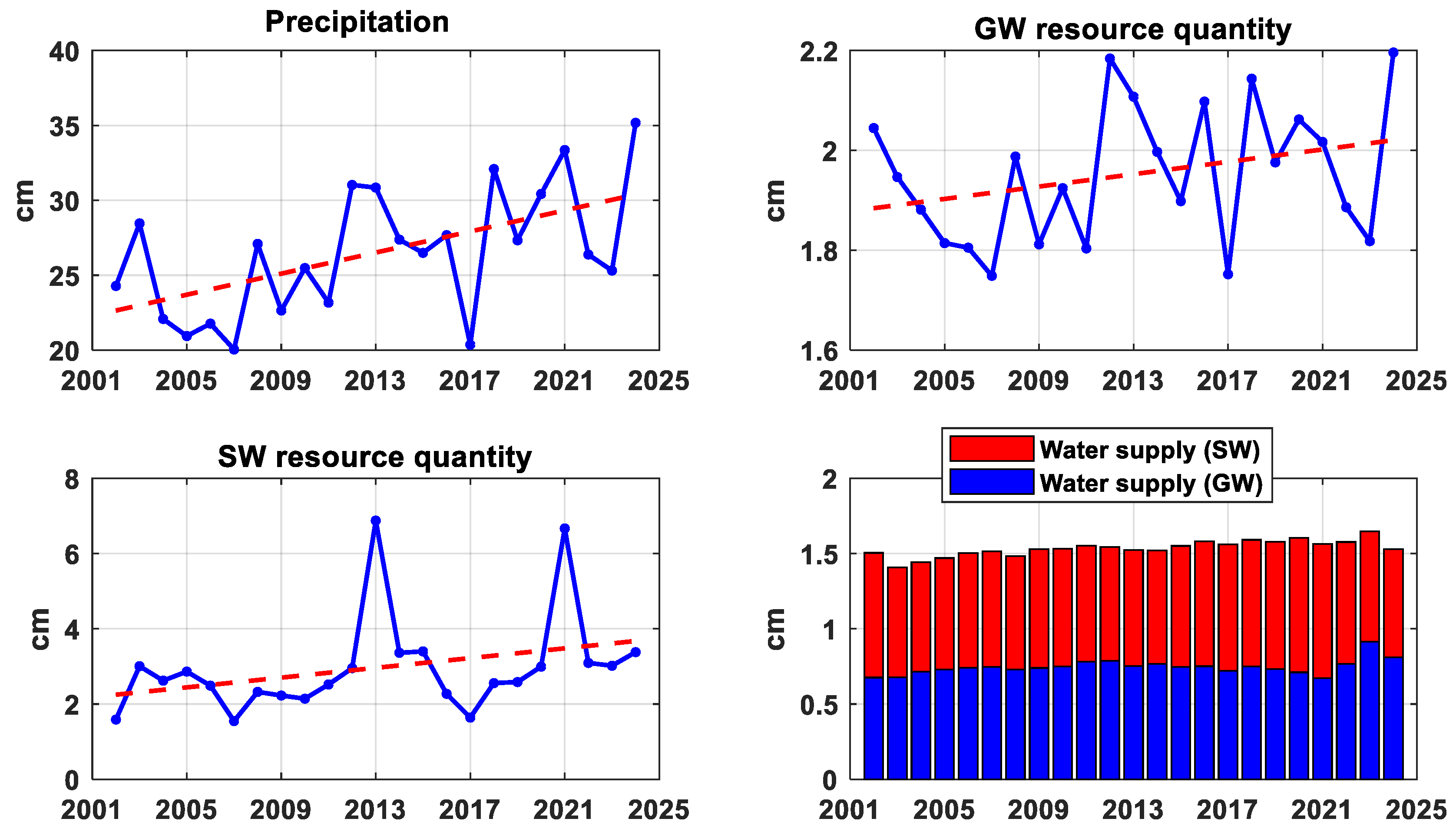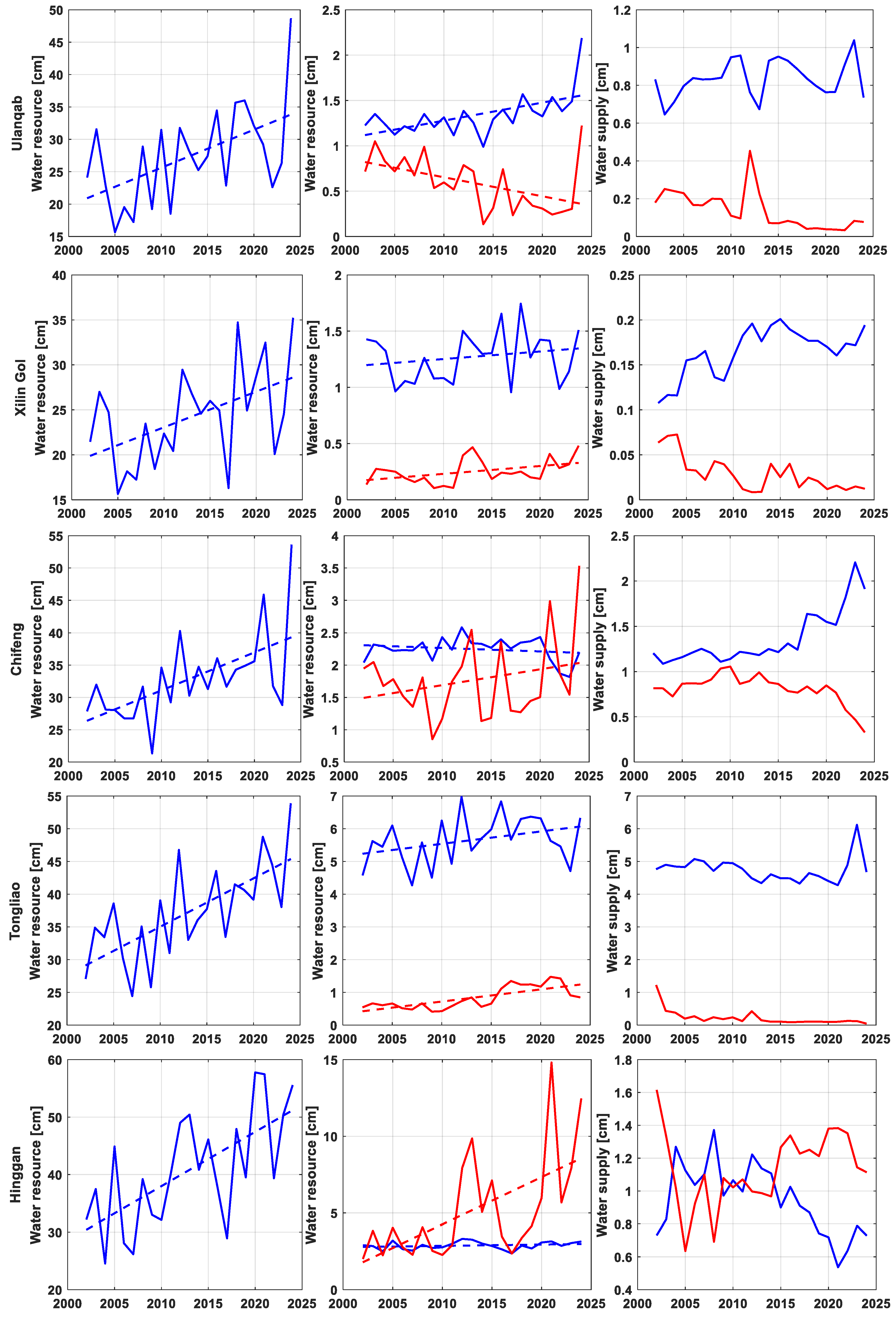 | Hinggan | ↑2002.4–2025.1 | ↓2002.4–2022.4 ↑2022.5–2025.1 | P↑; SW↑; GW↓ | SW↑; GW↓ |