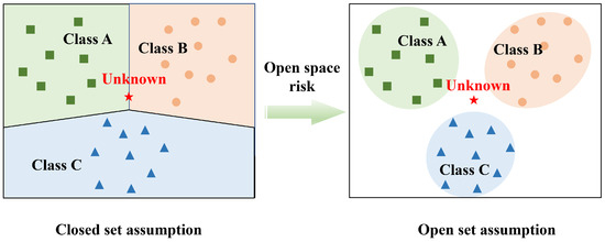 The essence of the aforementioned phenomenon lies in the failure of the ATR model to acknowledge the open space risks shown in Figure 1 [22,23]. Specifically, ATR models based on the closed-set assumption usually divide the feature space into several regions based on known target samples, including those regions that are far away from various categories of known target samples. The open space risk, which refers to the potential danger introduced to the ATR model when considering samples located in feature space regions significantly distant from known target samples as known samples. This phenomenon is consistent with the logic of human beings recognizing unfamiliar things [24]. Human beings’ understanding of everything exists within boundaries. When this boundary is exceeded, such things may become completely unfamiliar to humans. The open-set assumption is designed to enable the ATR model to recognize and describe this boundary. In other words, the open-set assumptions aim to represent the buffer zone of the target sample data distribution and risk. The ATR model should exercise caution when recognizing target samples that are located significantly distant from the known samples in the feature space.