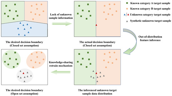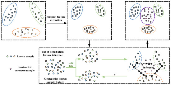 The objective of out-of-distribution feature inference of unknown target samples is to acquire effective prior knowledge regarding these samples. Moreover, the out-of-distribution feature inference needs to be based on the data distribution of known target samples. Therefore, the proposed method must take into account the potential risk of distribution overlap between the known sample data distribution and the constructed unknown sample data distribution. This prompts out-of-distribution feature inference to be implemented according to the process shown in Figure 3.