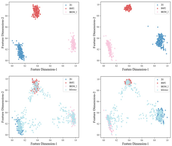 Figure 6. The contribution of compact feature extraction to out-of-distribution feature inference. (1) Upper left: the original feature distribution of the three categories of known samples. (2) Upper right: the compact feature distribution of the three categories of known samples. (3) Lower left: the unknown sample feature distribution inferred from the original feature distribution. (4) Lower right: the unknown sample feature distribution inferred from compact feature distribution.