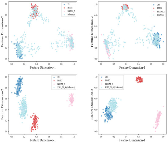 The validity of out-of-distribution feature inference is verified through two sets of experimental results in this subsection. First, the out-of-distribution feature inference is premised on compact feature extraction of known target samples. Therefore, these experiments need to verify the contribution of compact feature extraction to out-of-distribution feature inference. In response to the aforementioned issues, this experiment selected BRDM2, D7, and T62 to try to infer the unknown features of the target sample ZSU23/4. The features initially used in this section were those of the original target samples. Then, the proposed method employed compact features for out-of-distribution feature inference. The compact features were obtained by calculating the original sample features according to Equation (7). This experiment mapped the three categories of known sample features and the inferred unknown sample features into a unified latent feature space, subsequently utilizing the PCA algorithm [44] to condense these sample features into a two-dimensional space, and the results are shown in Figure 6.