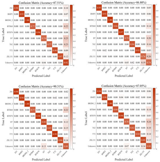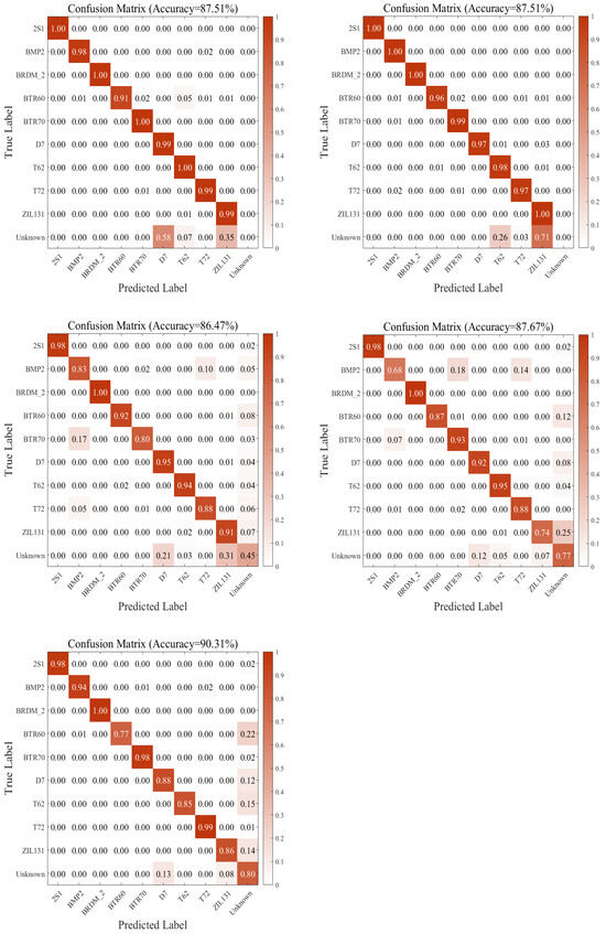 The five confusion matrices in Figure 9 demonstrate the contributions of different modules in the proposed method to the recognition of ten-category MSTAR data. Figure 9(1) shows the performance of a nine-category closed-set model directly applied to ten-category MSTAR data, achieving an accuracy of 87.51%. Notably, the model exhibited poor performance in recognizing the unknown class (ZSU_23_4 ), failing to distinguish novel data from existing classes. This highlights the necessity of open-set-recognition research. Figure 9(2) presents the results of extending the nine-category model by adding an output unit (ten categories in total), which retained the same accuracy of 87.51%. This indicates that merely expanding the model architecture still suffers from significant misrecognition and remains ineffective in identifying the unknown class (ZSU_23_4 ). Figure 9(3) demonstrates the performance of the ten-category extended model trained with out-of-distribution feature inference (without compact feature extraction), achieving 86.47% accuracy. Here, out-of-distribution feature inference synthesizes non-known-class samples via linear interpolation of inputs and labels, treating them as pseudo-unknown categories during training. This transforms the open-set problem into a closed-set recognition task and moderately improves recognition accuracy, particularly showing notable enhancement in unknown class recognition. Figure 9(4) combines out-of-distribution feature inference, yielding 87.67% accuracy. The compact feature extraction enhances intra-class feature compactness to reserve more feature space for unknown classes. Experimental results reveal that while this method improved the unknown class recognition accuracy from 45% to 77%, it significantly increased the risk of misclassifying known categories. To mitigate this issue, as illustrated in Figure 9(5), the advantage of proposed method is that it incrementally integrates out-of-distribution feature inference and the knowledge-sharing retrain mechanism. This approach achieves a recognition rate of 90.31%. The knowledge-sharing retrain mechanism leverages a knowledge distillation mechanism to guide the training of the extended model, alleviating the degradation in known-category recognition caused by compact feature extraction.