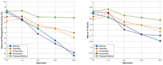 In this experiment, the first five classes of the ten-category MSTAR dataset were selected as known categories. The number of unknown categories was dynamically adjusted based on predefined known category configurations (5, 6, 7, 8, and 9), generating test sets with controlled openness levels ranging from 5.13% to 29.29%. A systematic comparative analysis was performed between the proposed method and four benchmark open-set-recognition approaches: Softmax [45], OpenMax [21], G-OpenMax [46], and Placeholder [47]. To maintain the fairness of the experimental setup, all comparative methods shared identical backbone network architectures and hyperparameter configurations. All methods set the mini-batch size to 64 during the model pre-training phase, and the recognition model was optimized and updated for 100 epochs using the Adam optimizer with a learning rate of 0.001. Moreover, in the open-set training phase, the tail size parameter of the OpenMax and G-OpenMax methods was set to 30, and the optimal decision threshold for distinguishing known classes from unknown classes was determined through traversal search in the [0.1, 0.9] interval. The mixup alpha parameter of the Placeholder method was set to 0.5. Quantitative evaluation using accuracy and macro F1-score metrics was conducted to assess performance across incremental openness levels. The experimental results are shown in Table 2 and Table 3 and Figure 10.