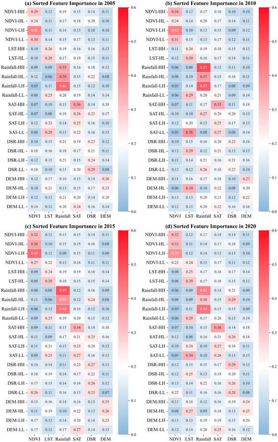 Based on the LISA clustering results between CWSI and environmental factors, RF models were constructed for each cluster type (HH, HL, LH, LL) to identify the most important drivers of drought under different spatial interaction patterns. Figure 8 presents the RF-based variable importance scores across four selected years (2005, 2010, 2015, and 2020), where each row represents a specific cluster (e.g., NDVI-HH), and each column shows the relative importance of the six influencing variables (NDVI, LST, Rainfall, SAT, DSR, and DEM). The higher the score, the greater the explanatory power of that variable in the corresponding spatial context.