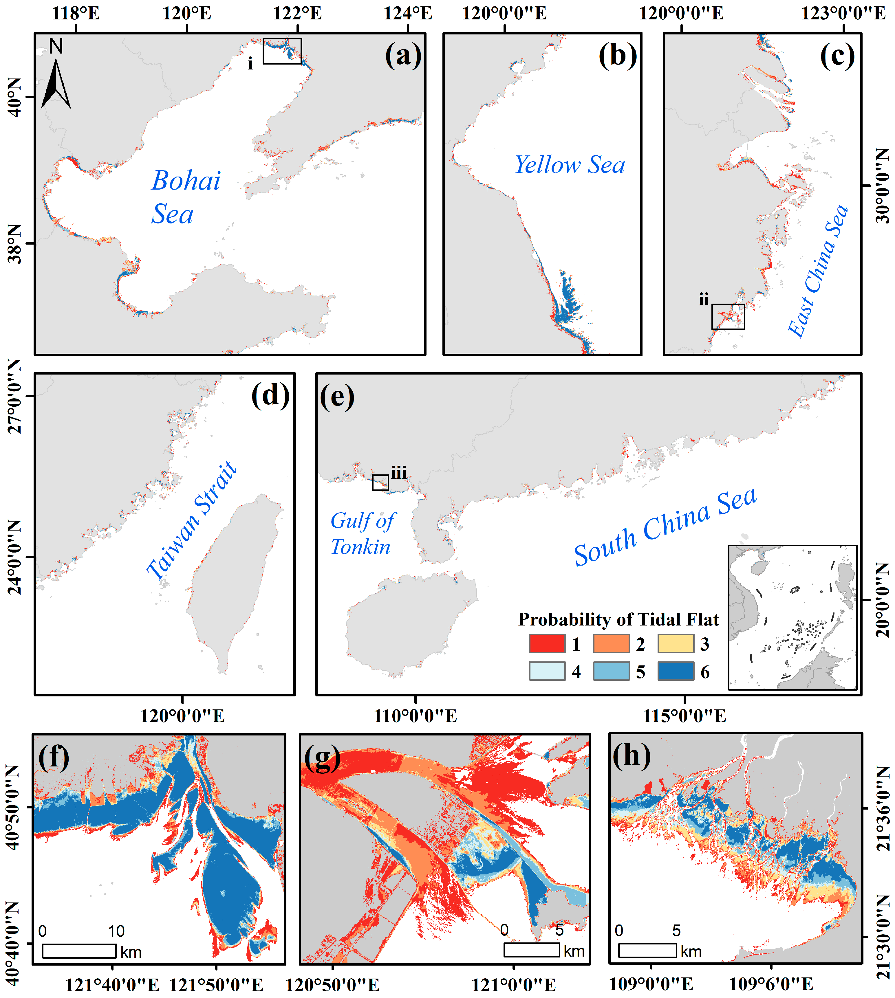 - Zhao, C.; Qin, C.-Z.; Teng, J. Mapping large-area tidal flats without the dependence on tidal elevations: A case study of Southern China. ISPRS J. Photogramm. Remote Sens. 2020, 159, 256–270. [Google Scholar] [CrossRef]