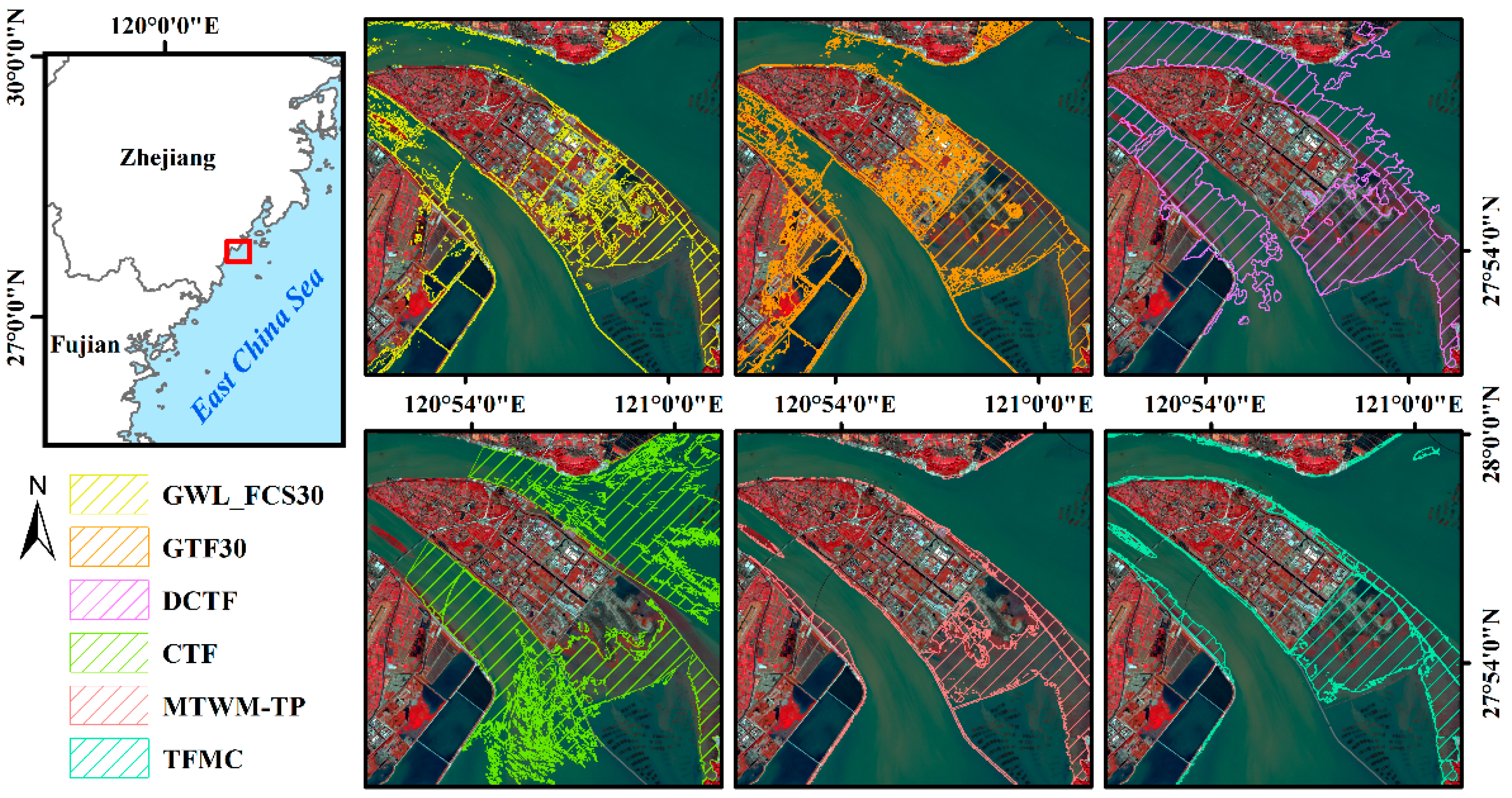 | DCTF [24] | 1989–2020 | China | Landsat | 30 m | NDVI, mNDWI, LSWI, BSI, EVI, MSAVI, NDBI | 90.84% | Tidal flats, Salt marshes |