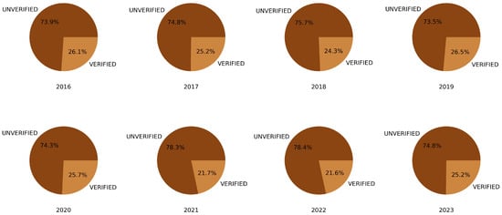 Proportion of verified and unverified oil spill events reported by the CleanSeaNet program from 2016 to 2023.