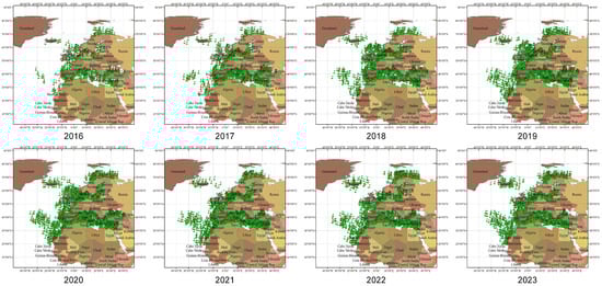 Traditional oil spill monitoring relies on visual inspections, ship-based sampling, and in situ sensors [4], which can provide accurate localized information. However, these methods are limited by subjectivity, adverse weather, labor-intensive and time-consuming analyses, and narrow spatial coverage with high operational costs. For example, Figure 1 shows the proportion of verified and unverified oil spill events reported by the CleanSeaNet program from 2016 to 2023. A considerable number of reported incidents were not manually validated, highlighting the resource-intensive nature of manual validation. Specifically, before the advent of artificial intelligence (AI) methods, each detection had to undergo manual verification to determine whether it truly represented an oil spill or a look-alike phenomenon such as low-wind areas, algal blooms, or biogenic films. This verification process typically requires cross-referencing with ancillary data and expert interpretation, making it highly resource-intensive and underscoring the urgent need for robust and scalable AI methods capable of generalizing across diverse environmental conditions. The advancement in remote sensing (RS) technology and the wider availability of satellite imagery have made RS a practical and effective alternative to traditional oil spill monitoring. RS enables large-scale, rapid detection and timely response during major spill events. In particular, the integration of AI methods has significantly enhanced the capability for automated oil spill detection, classification, and thickness estimation. Furthermore, the Marine Pollution Products of the National Oceanic and Atmospheric Administration (NOAA) [5], CleanSeaNet program of the EMSA [6,7], and Copernicus Sentinel Program [8] provide extensive publicly available RS imagery and oil spill coordinates. These open resources support the construction of large-scale deep learning training and benchmark datasets, significantly advancing research on oil spill monitoring. As shown in Figure 2, the spatial distribution of oil spill incidents reported by CleanSeaNet from 2016 to 2023 demonstrates the wide geographic coverage and long-term monitoring capability of these datasets. Therefore, recent research has focused on developing AI-enabled methods using RS imagery that significantly improve monitoring efficiency and analytical accuracy. These advances have played a pivotal role in both technological innovation and practical deployment for marine oil spill monitoring and response [9].