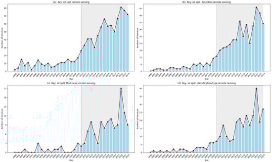Accurate and timely monitoring of oil spills plays a vital role in the effective management of sudden spill events and in ensuring a swift, coordinated emergency response. With continuous advancements in RS technology and AI methods, AI-driven RS methods have become an essential and efficient tool for marine oil spill monitoring. Hence, we systematically analyzed relevant literature primarily sourced from the Web of Science, ensuring a comprehensive understanding of the latest advancements in remote sensing applications for oil spill monitoring. Specifically, we employed the keywords “oil spill remote sensing”, “oil spill detection remote sensing”, “oil spill thickness remote sensing”, and “oil spill classification/type remote sensing” to retrieve relevant publications. Figure 3 illustrates the trend of publications retrieved using our selected keywords from 1990 to 2024, demonstrating a steady rise in research interest in this field, which has stabilized in recent years. Notably, we can observe a notable surge in research on oil spill RS after 2010, which can be driven by the Deepwater Horizon spill in the Gulf of Mexico. This event provides a unique opportunity for field application and integration of new sensor technology, thereby promoting the development of oil spill monitoring methods based on RS technology [91]. In addition, since 2015, oil spill monitoring methods have also developed rapidly, largely driven by the advances in deep learning methods and RS technology. Specifically, the launch and operation of satellites such as Sentinel-1 and Gaofen series have provided abundant high-quality RS data. Meanwhile, the introduction of deep learning methods has significantly improved the automation and accuracy of oil spill detection, promoting the transition of oil spill monitoring toward more intelligent and precise methods.