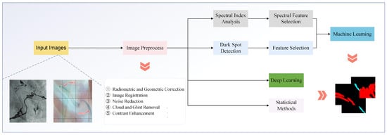 Figure 4 shows a general framework integrating AI methods with multi-source RS imagery for oil spill detection. First, the input images undergo a series of image preprocessing steps to improve data quality and reduce interference. Then, the images can be analyzed using spectral index analysis for feature extraction or dark spot detection to identify potential oil spill areas. Extracted features are further processed through spectral signature matching or feature selection, which are used to train machine learning models to detect oil spills. Moreover, deep learning enables the automatic extraction of high-level features for OSD, whereas statistical methods offer conventional pattern recognition capabilities.