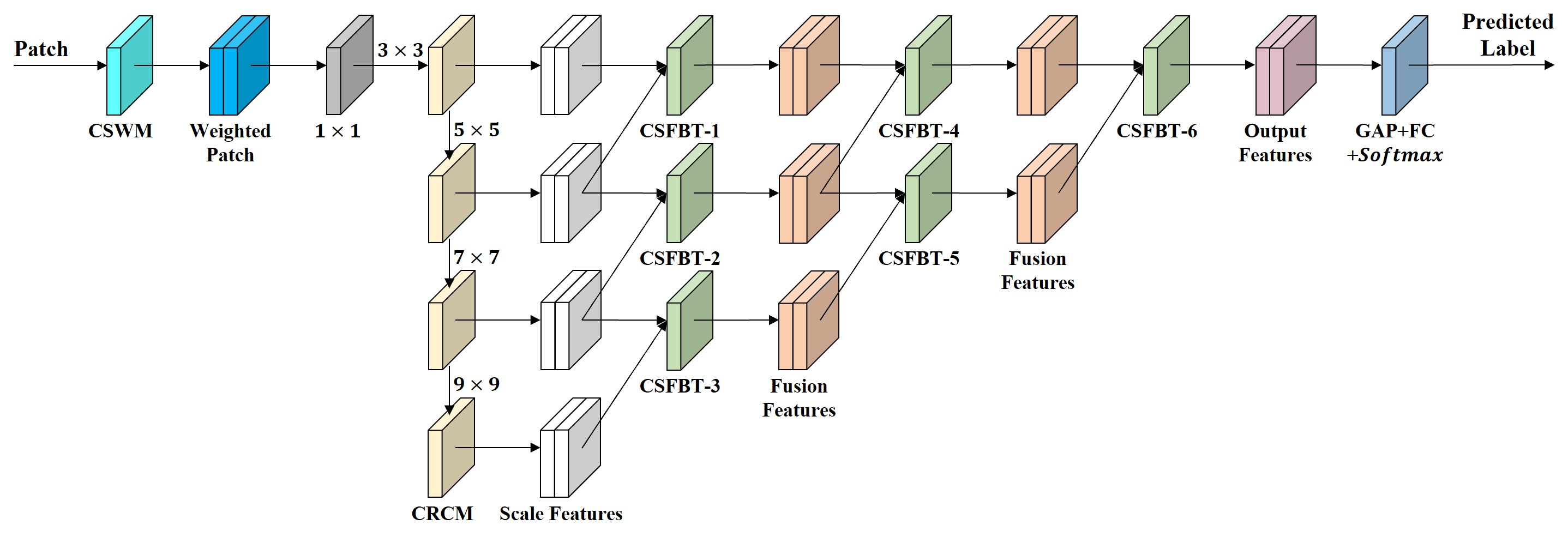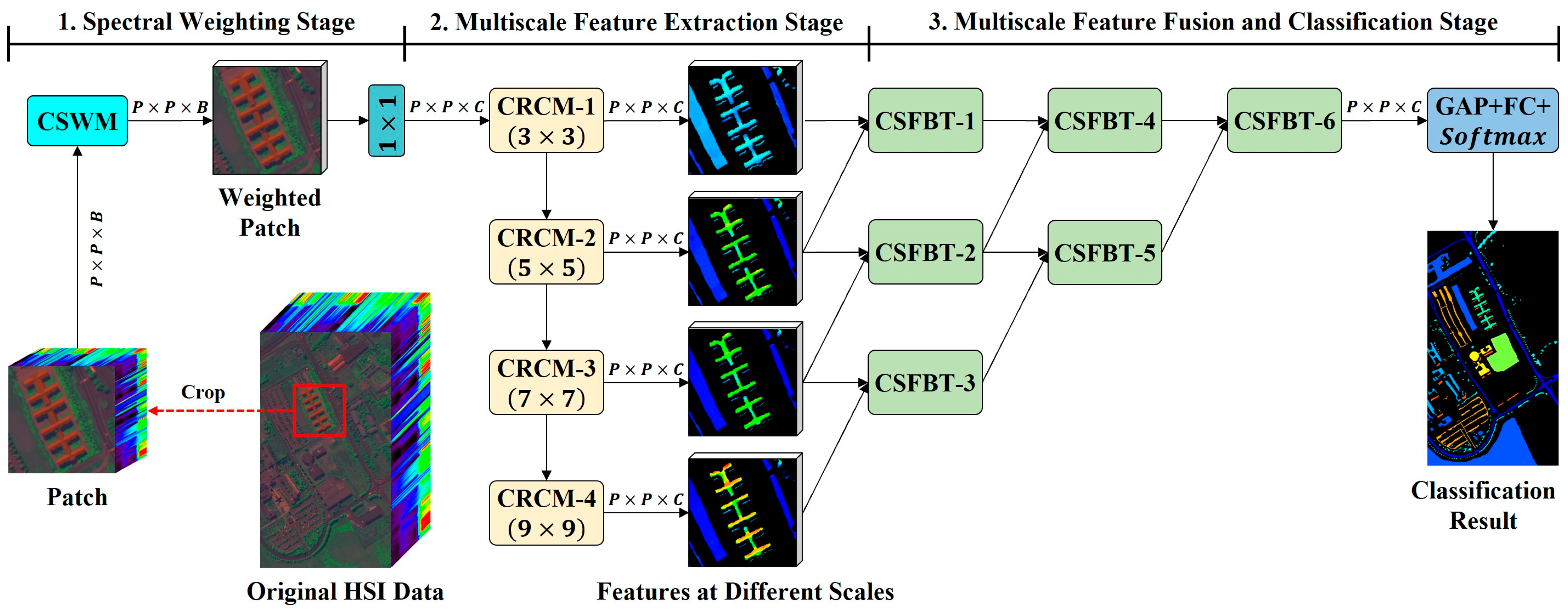 The overall framework of CPMFFormer. CPMFFormer is composed of one CSWM, four CRCMs, and six cross-scale fusion bottleneck transformers (CSFBT). CSWM, CRCM, and CSFBT are used to obtain class-specific spectral weights, features at different scales, and progressive fusion features, respectively. Following CSFBT-6, CPMFFormer uses a global average pooling (GAP) layer, a fully connected (FC) layer, and a function to predict the final classification result.
