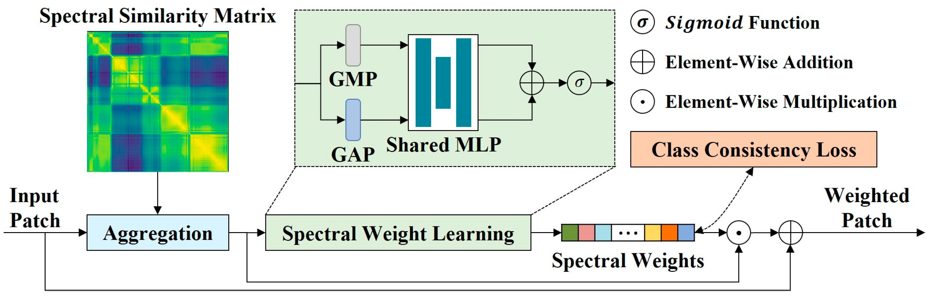 The framework of CSWM. CSWM is composed of an aggregation operation, a spectral wight learning block, and a class consistency loss function. The aggregation operation smooths the spectral information differences between intra-class input patches. The spectral weight learning block performs adaptive spectral weighting. The class consistency loss function is used to learn the spectral weight centers of different ground objects and generate class-specific spectral weights.