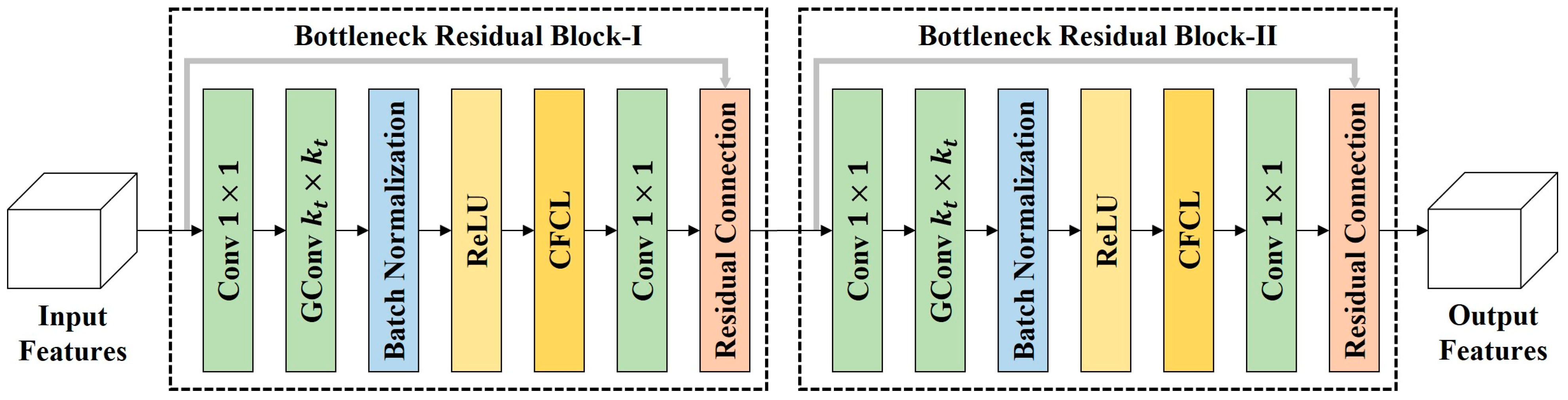 The framework of CRCM. CRCM is composed of two bottleneck residual blocks. In each bottleneck residual block, two convolutional layers are used to form the bottleneck structure, and a group convolution layer is used to extract features at the tth scale. Moreover, the embedded center feature calibration layer (CFCL) is used to model the dependencies between the center pixel and its neighboring pixels. This helps CRCM to reduce the impact of interference information introduced by abnormal pixels on the classification decision of the center pixel.