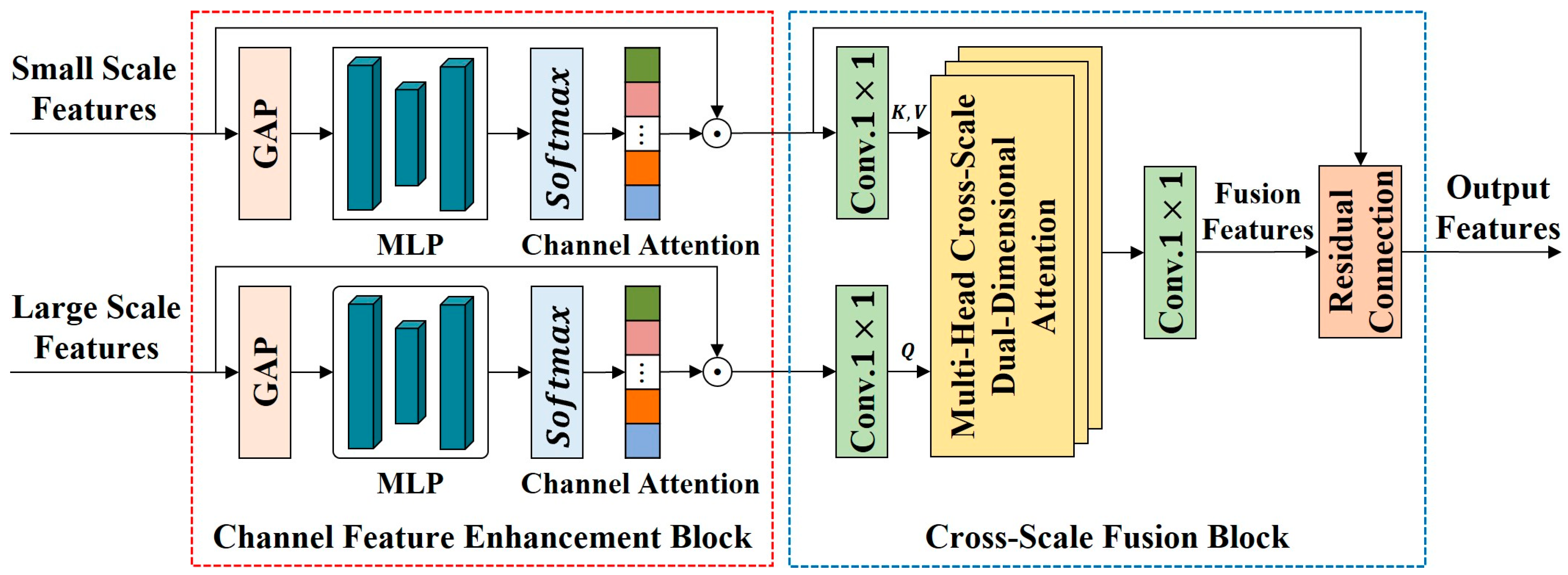 The framework of CSFBT. CSFBT takes adjacent scale features as input. It consists of a channel feature enhancement block (CFEB) and a cross-scale fusion block (CSFB). CFEB models inter-channel dependencies and emphasizes valuable channel features. CSFB uses a multi-head cross-scale dual-dimensional attention (MHCSD2A) mechanism to integrate complementary information across adjacent scale features from both spatial and channel dimensions.