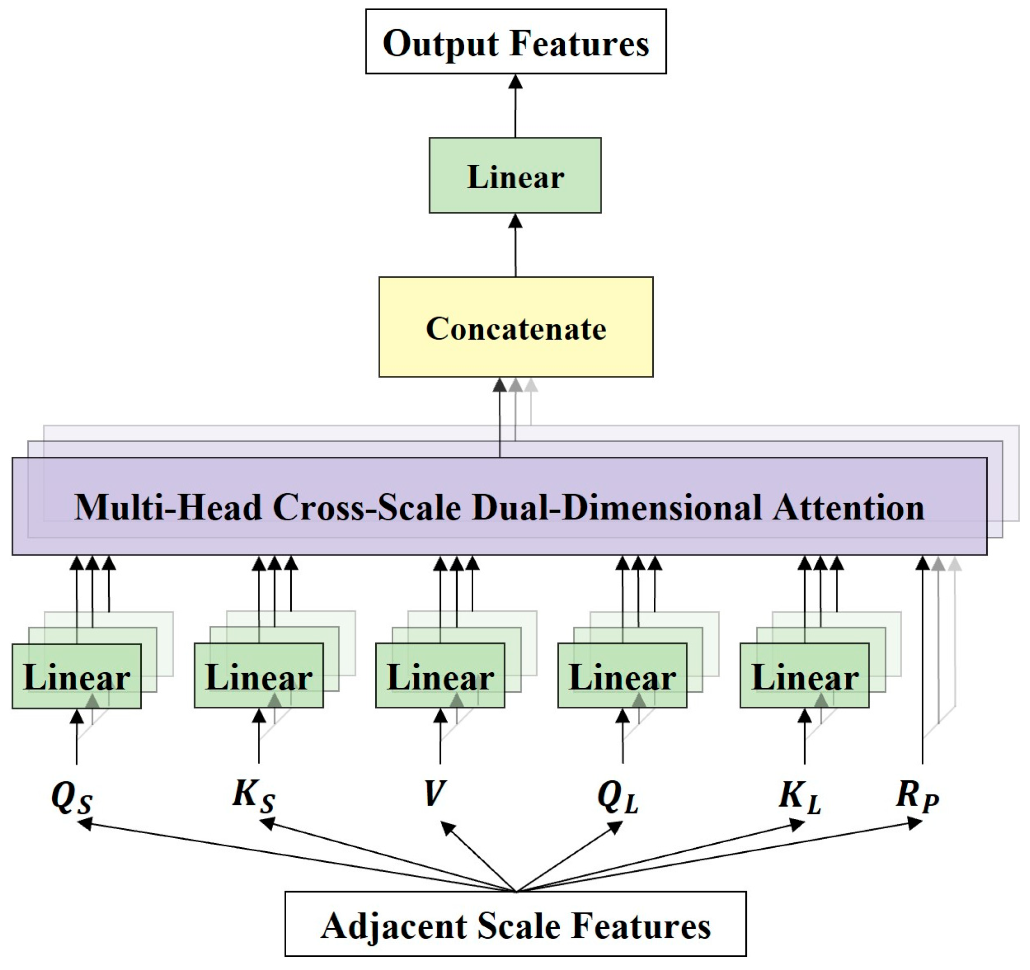 The framework of MHCSD2A. MHCSD2A first maps the input features to different attention heads using five linear projection layers. Then, the cross-scale dual-dimensional attention (CSD2A) mechanism is computed in each head. Finally, the computation results of all heads are concatenated, and a linear projection layer is used to obtain the final output features.