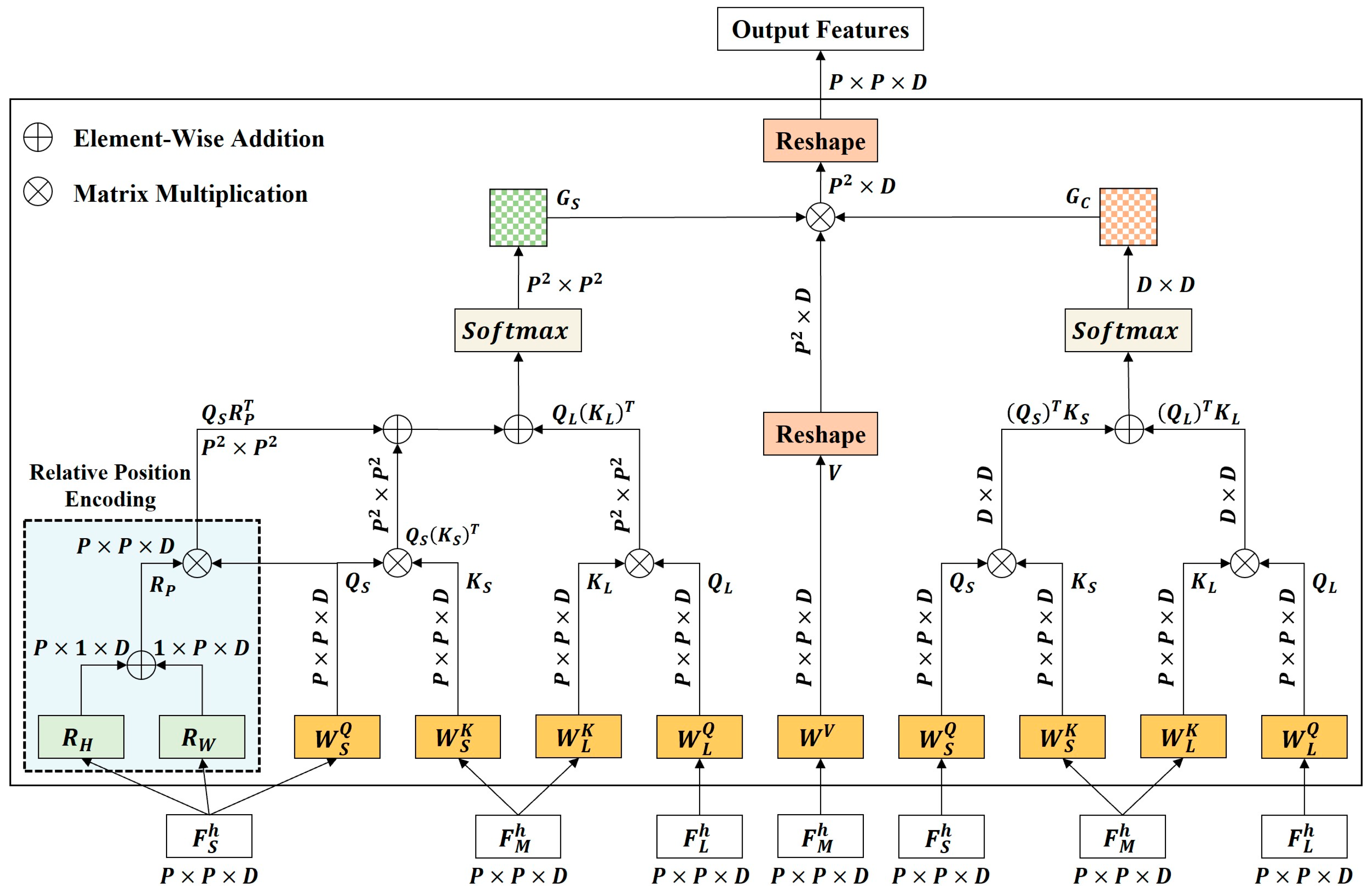 The framework of CSD2A. CSD2A achieves complementary semantic fusion between small-scale features and large-scale features by computing attention from both spatial and channel dimensions. This mechanism introduces the relative position encoding to better model complex spatial relationships and preserves structural details during cross-scale fusion.