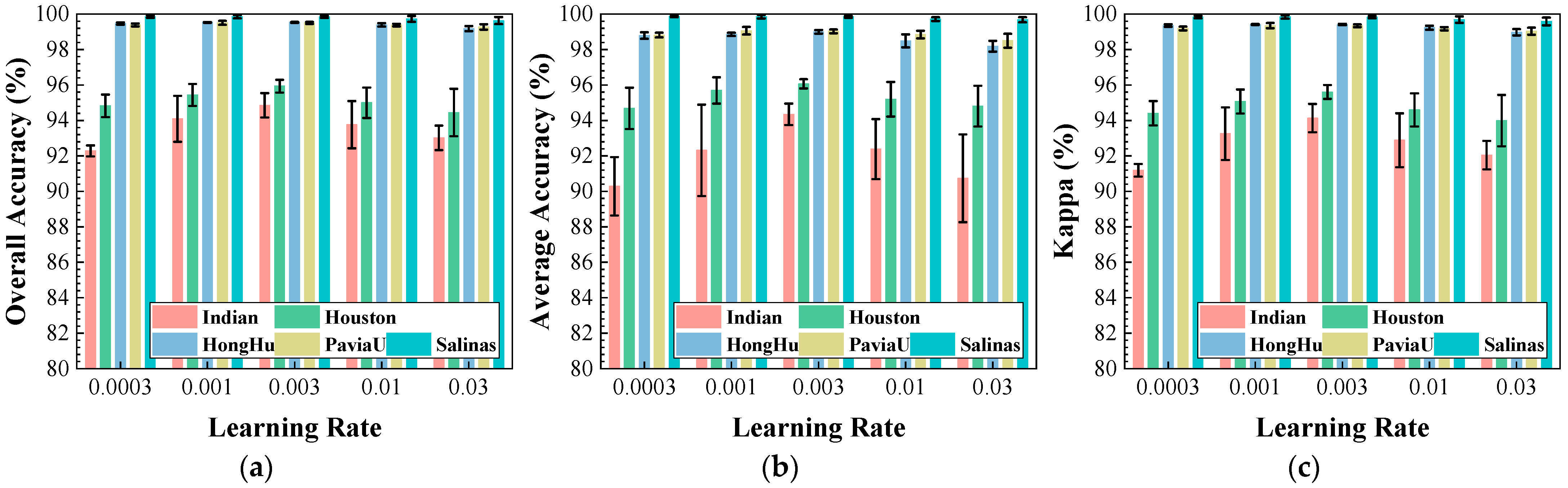 Impact of learning rate on classification performance: (a) OA; (b) AA; (c) .
