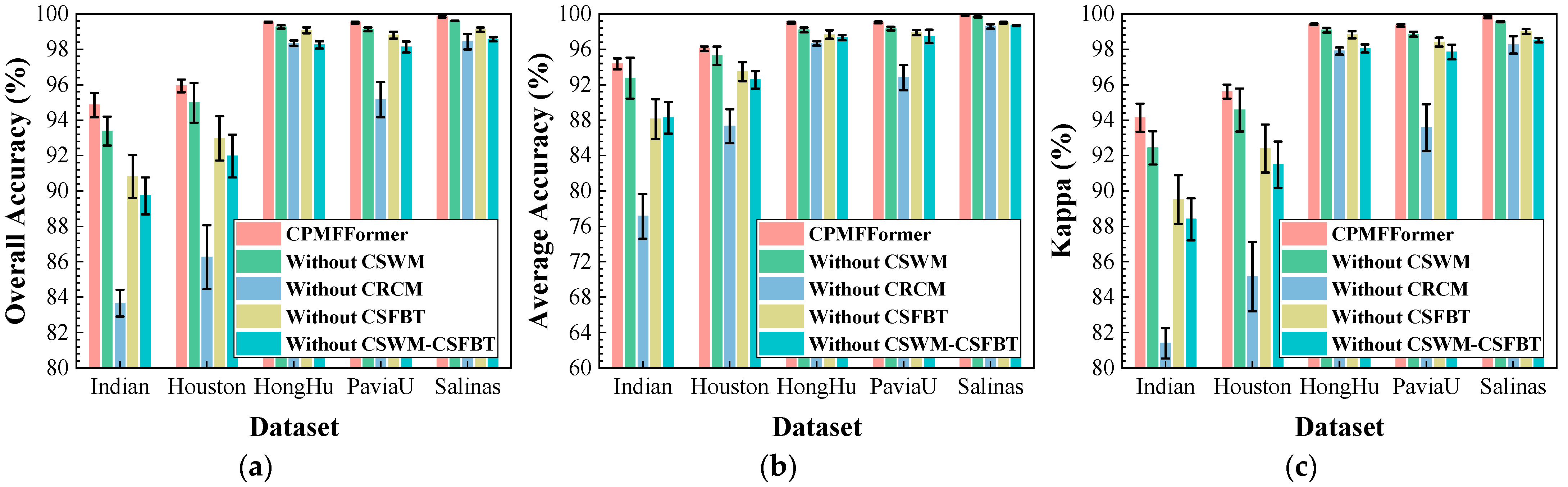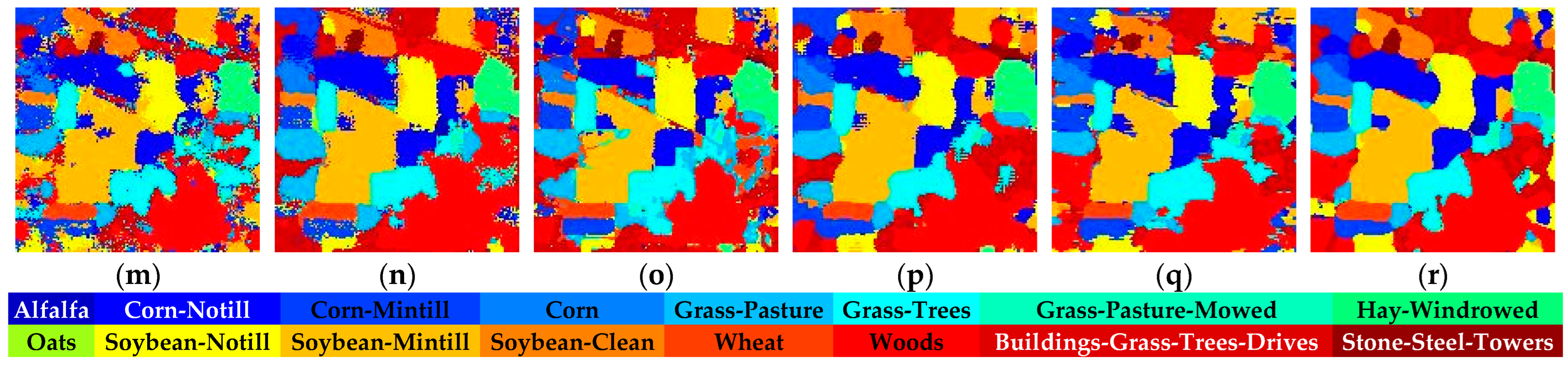 | PaviaU | OA (%) | 99.26 ± 0.13 | 99.31 ± 0.21 | 99.36 ± 0.21 | 99.27 ± 0.17 | 99.13 ± 0.25 | 99.50 ± 0.06 |