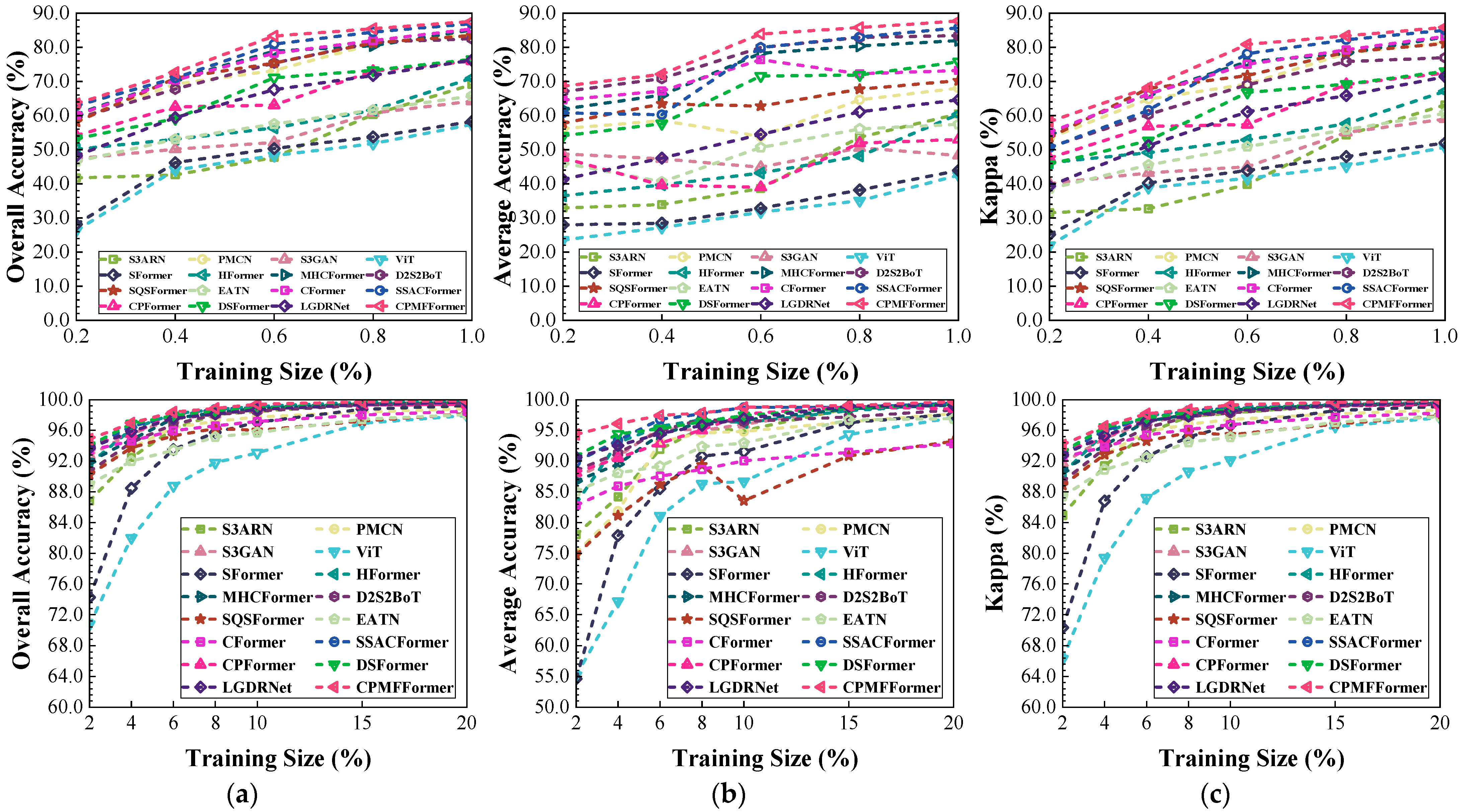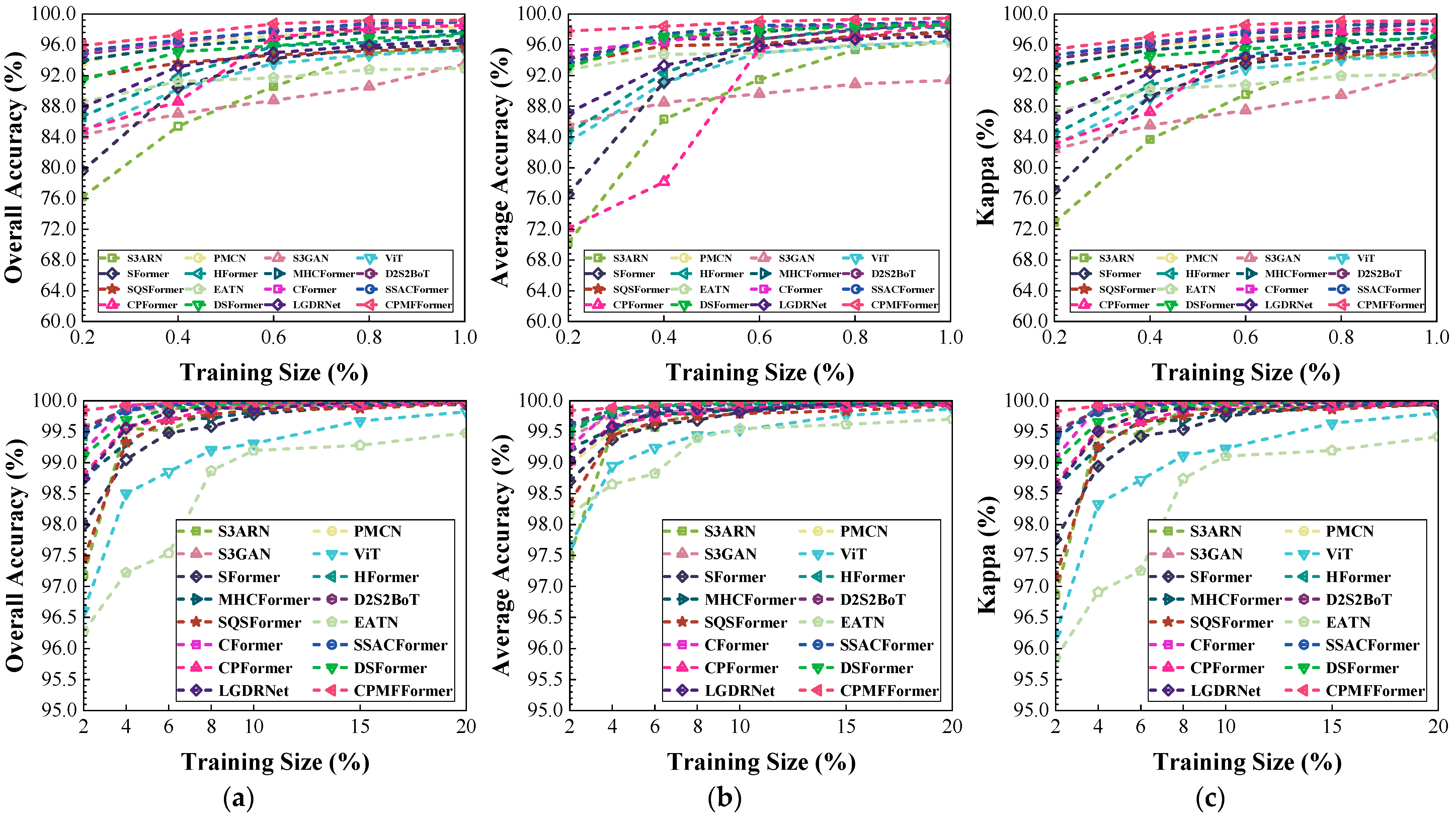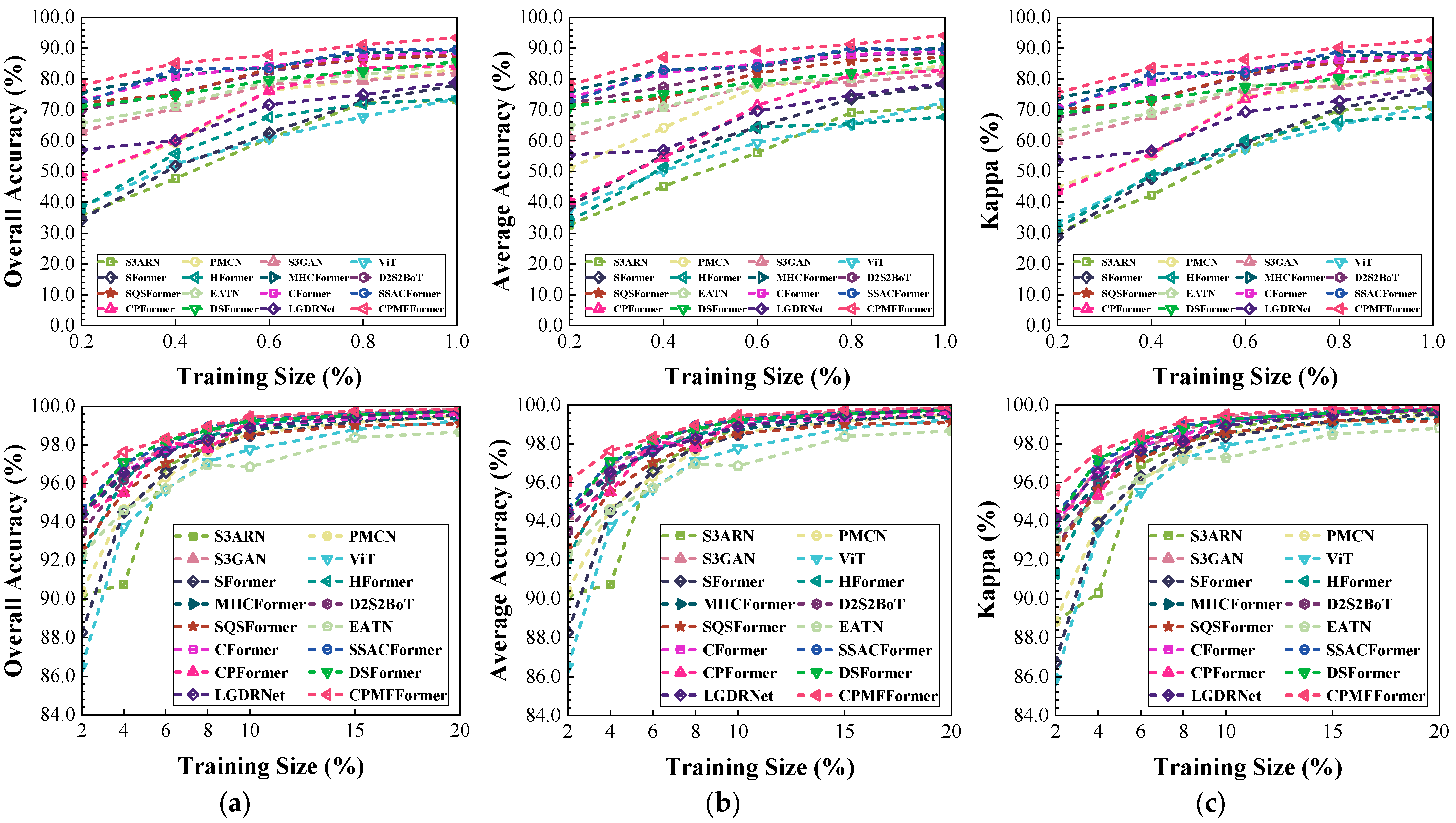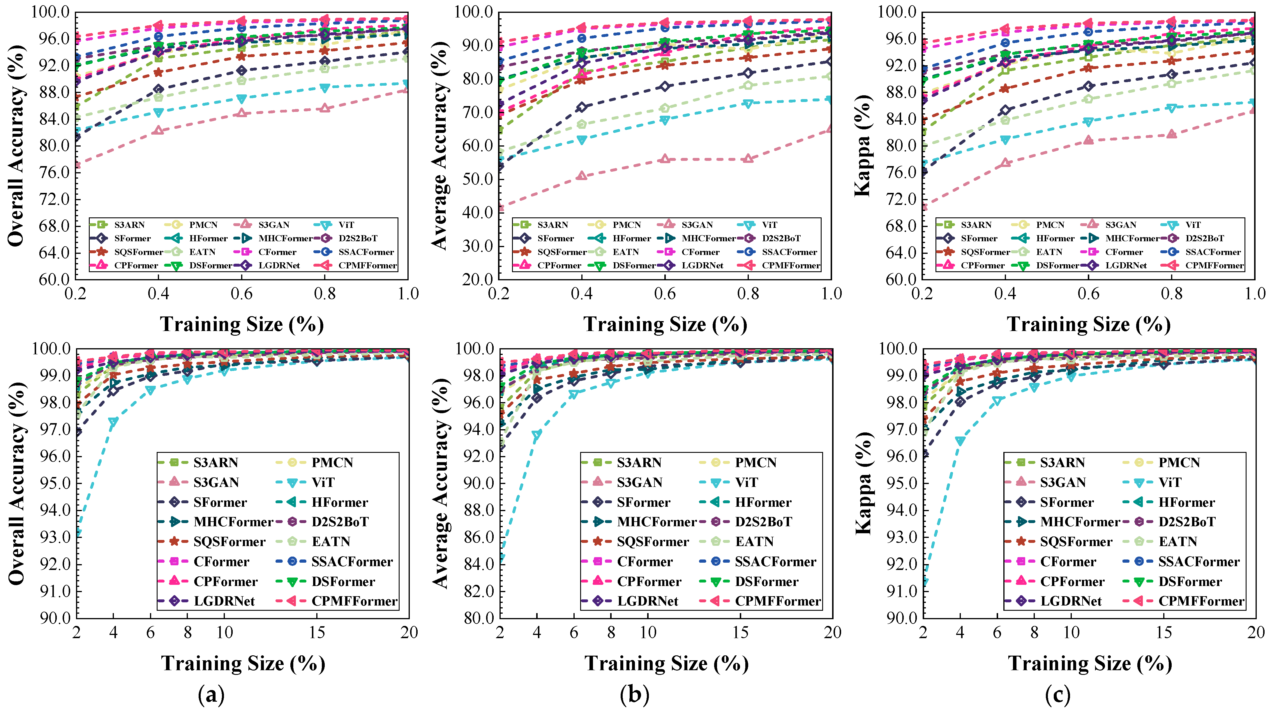 Classification performance obtained by different networks with different training sample sizes from the PaviaU dataset: (a) OA; (b) AA; (c) .