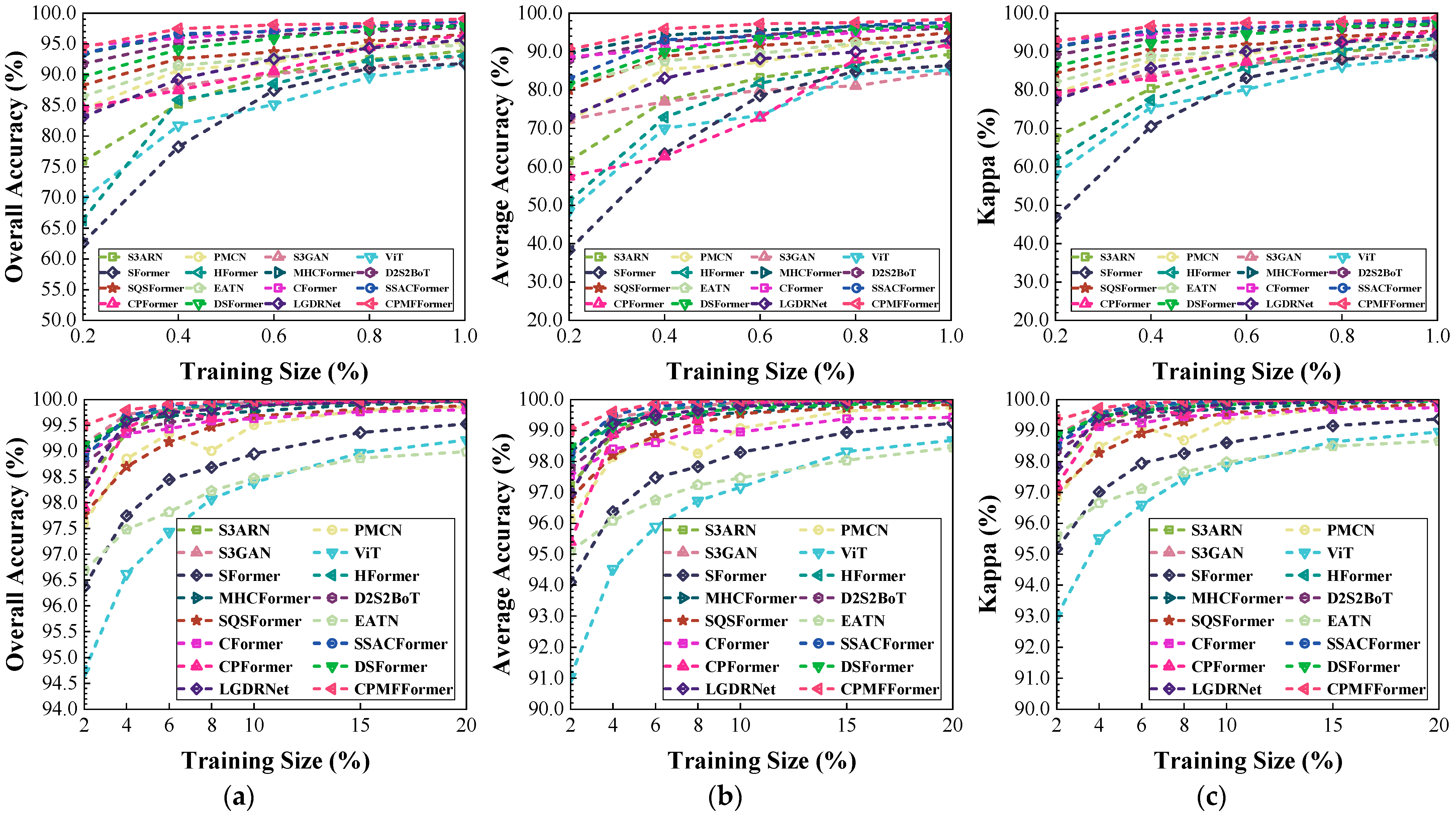 Classification performance obtained by different networks with different training sample sizes from the HongHu dataset: (a) OA; (b) AA; (c) .