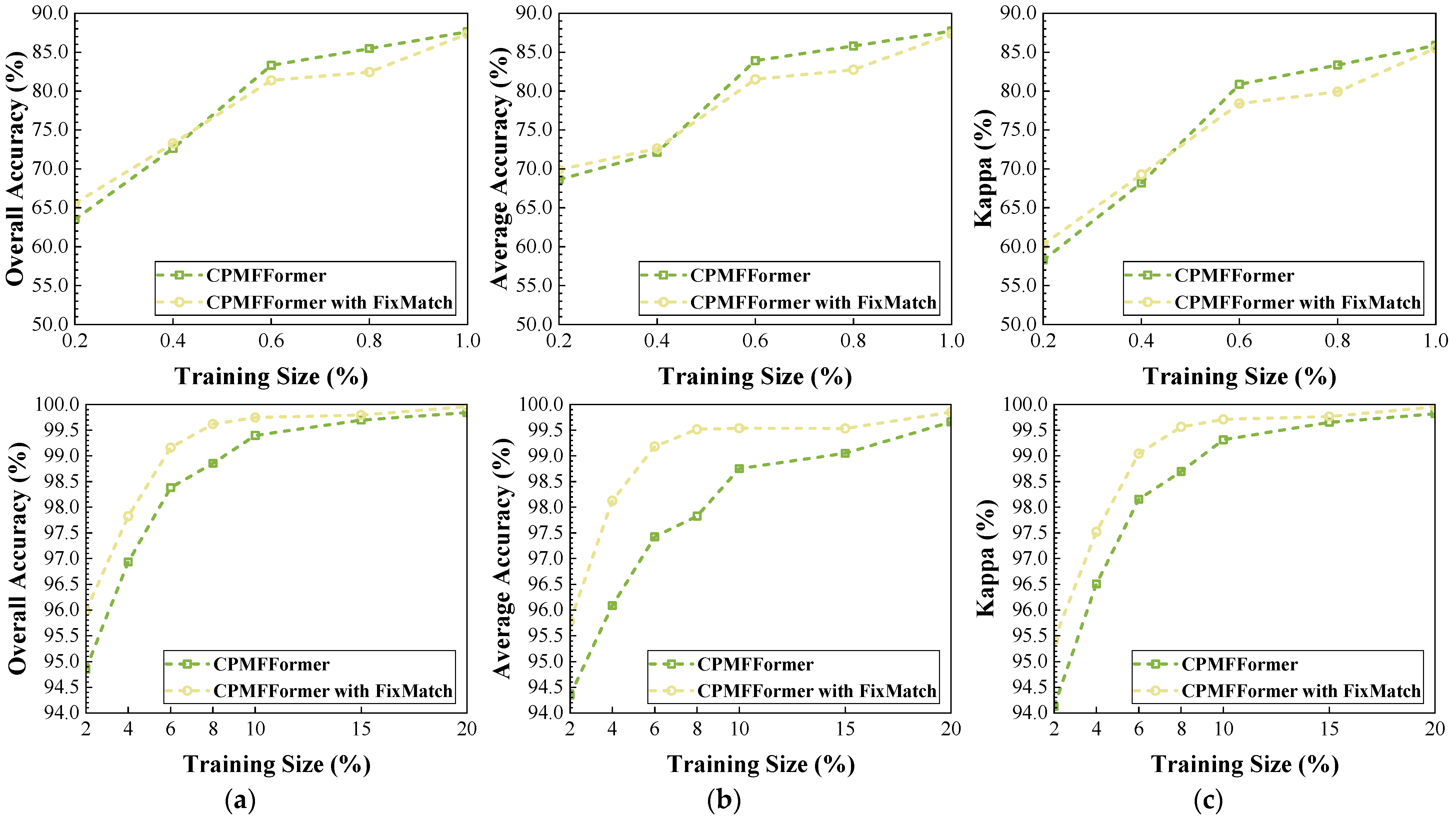 The performance changes in CPMFFormer after introducing FixMatch: (a) OA; (b) AA; (c) .