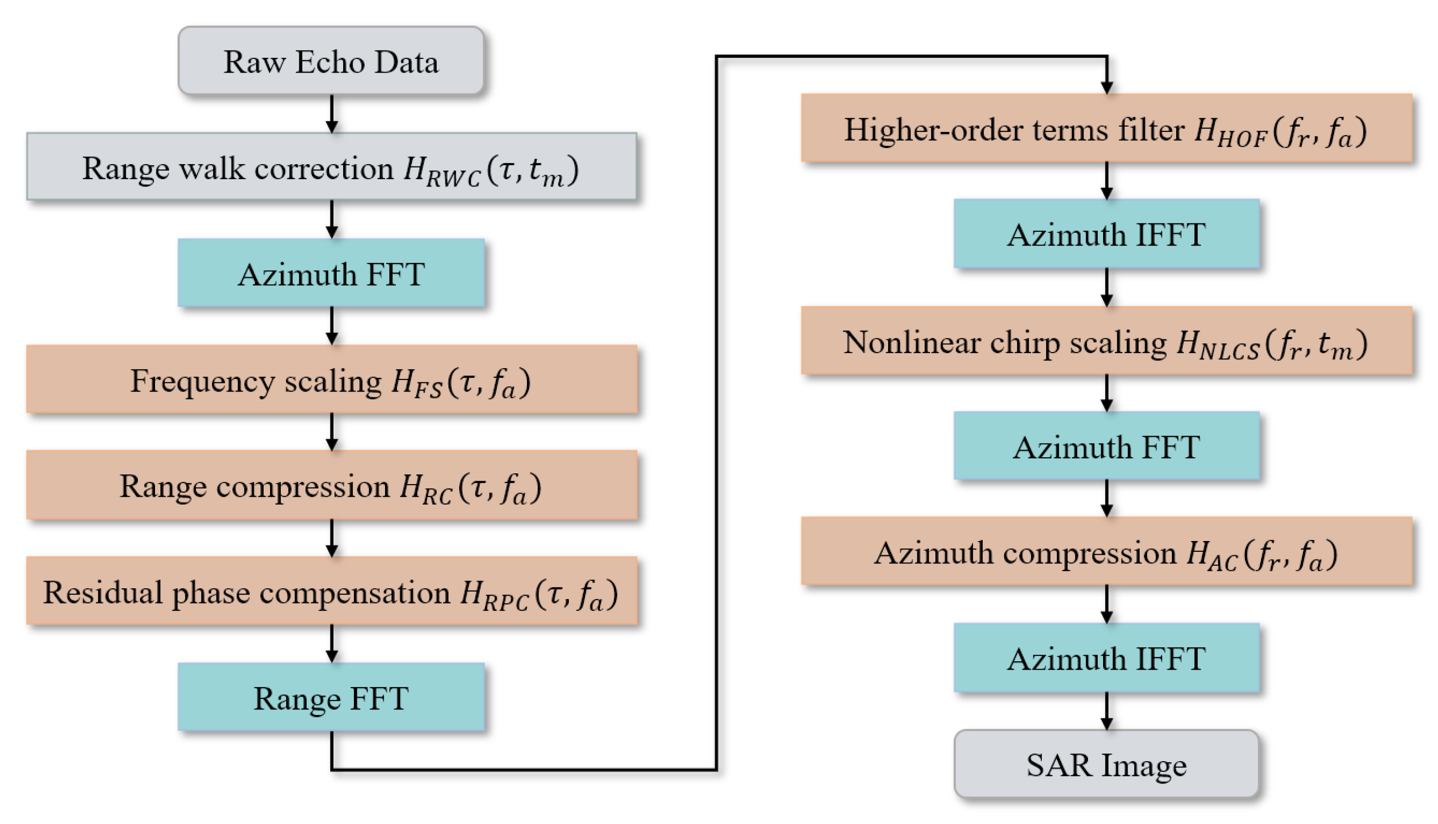 - Fan, W.; Zhang, M.; Li, J.; Wei, P. Modified range-Doppler algorithm for high squint SAR echo processing. IEEE Geosci. Remote Sens. Lett. 2018, 16, 422–426. [Google Scholar] [CrossRef]