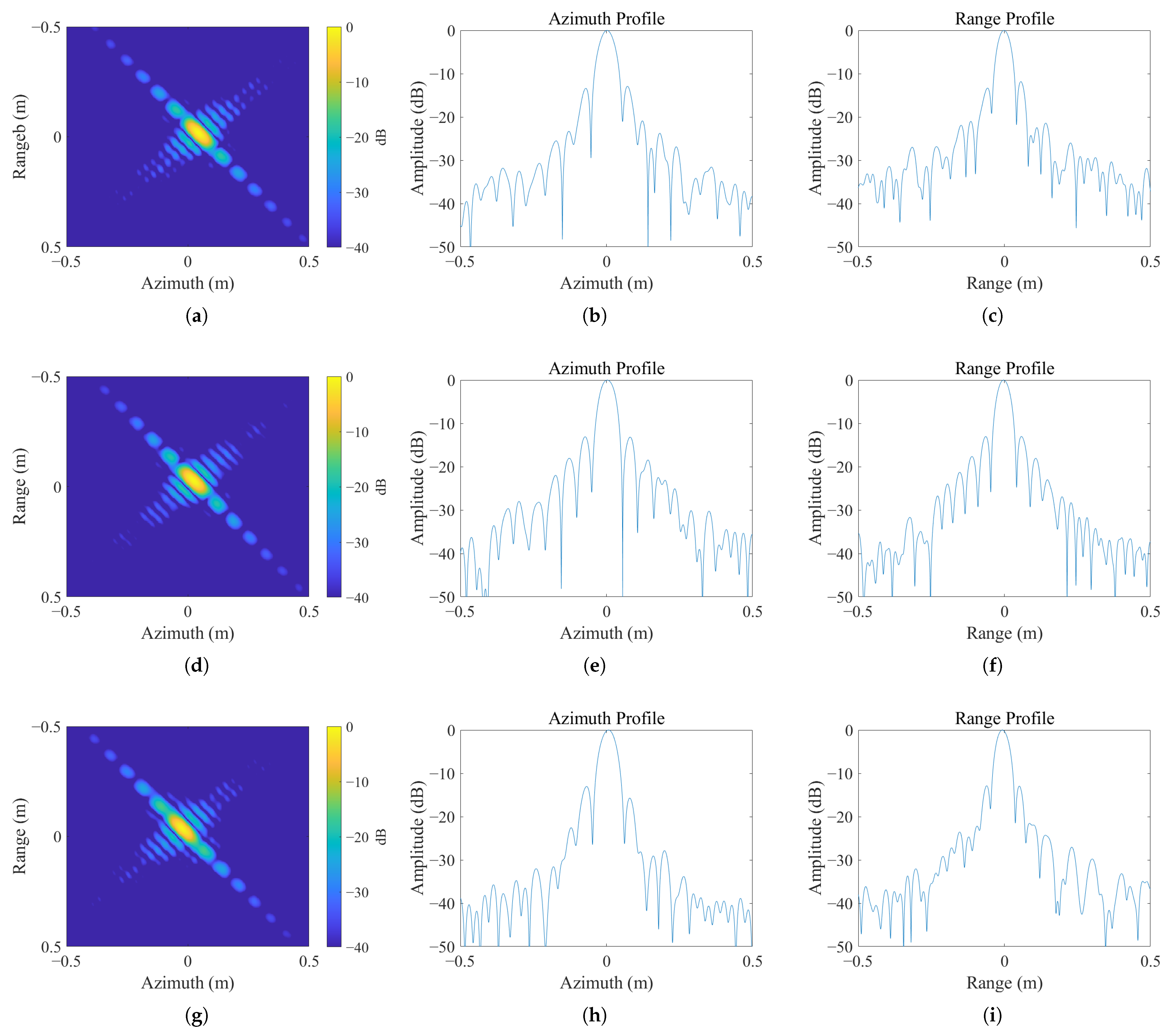| PSLR (dB) | Range | −12.03/−11.14/−10.65 | −13.56/−13.93/−13.63 |