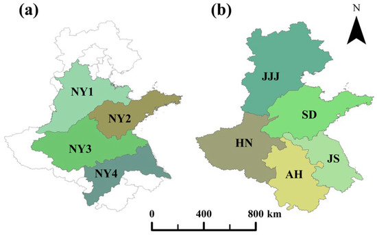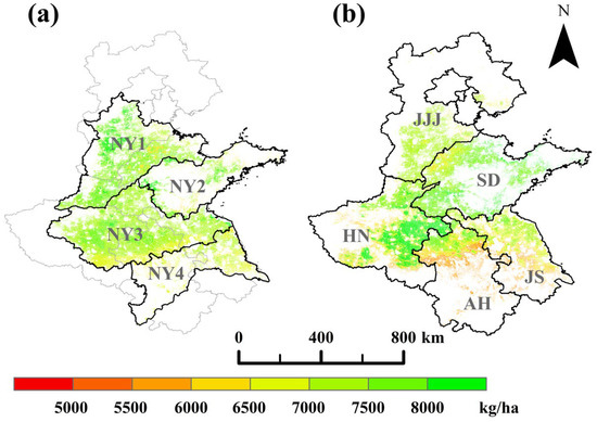 This study evaluated and compared the accuracy of winter wheat-yield estimation models based on three different zoning approaches: the phenological zoning proposed in this research, the traditional Chinese agricultural resource and environmental zoning, and the provincial administrative zoning. The wheat planting regionalization data is from the Dataset of Agricultural Resource and Environment Zoning of China [44]. This dataset classifies specific geographical units of China’s land into distinct agricultural resource and environmental zones, based on regional characteristics of agricultural production, resource suitability, and environmental challenges. This study primarily focuses on the winter wheat-producing regions of the Huang-Huai-Hai region, selecting the following zones for comparative experiments: NY1: North China Plain Zone; NY2: Shandong Hilly Zone; NY3: Huang-Huai-Hai Plain Zone; and NY4: Jianghuai Region (Figure 2a). Provincial administrative zoning is based on the current administrative boundaries of the provinces in the Huang-Huai-Hai region (Figure 2b), including JJJ: Beijing, Tianjin, and Hebei Province; SD: Shandong Province; HN: Henan Province; AH: Anhui Province; and JS: Jiangsu Province.