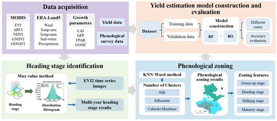 To address the issue of insufficient consideration of phenological heterogeneity in current winter wheat-yield estimation, this study proposes a framework for constructing a remote sensing and climate multi-factor driven model for winter wheat-yield estimation based on phenological zoning. The study first employs time-series remote sensing data to extract the winter wheat heading stages in the Huang-Huai-Hai region. Subsequently, the Dynamic K-Nearest Neighbors-Ward (KNN-Ward) spatial clustering algorithm is applied to derive phenological zones with high internal consistency within the study area. Based on this foundation, a Bayesian-optimized random forest model was constructed to estimate regional winter wheat-yields, incorporating crop vegetation indices, growth parameters, and meteorological data relevant to yield formation during the winter wheat growth period. The study conducted comparative analyses of the accuracy and robustness of yield-estimation models using traditional administrative and agricultural zoning systems, aiming to evaluate the role of phenological zoning in enhancing the adaptability of regional yield-estimation models.