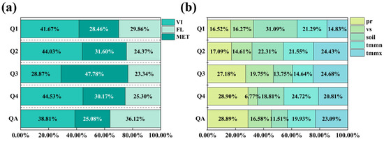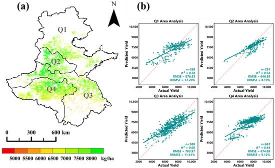 Figure 8 presents the winter wheat-yield estimation results based on four phenology-based zoning models (Q1–Q4). Figure 8a shows the spatial distribution of estimated yields for 2021 as an example, while Figure 8b displays the overall scatter plots combining the cross-validation results from all six years (2016–2021). As illustrated in Figure 8, the modeling accuracy (R2) of the four zonal models exceeded 0.54. Among them, Zone Q3 exhibited the highest accuracy, with an R2 of 0.68 and an RMSE of 783.97 kg/ha. Based on the cross-validation results, the R2 values across the four zones ranged from 0.54 to 0.68. Compared with the non-zonal model for the entire Huang-Huai-Hai region (Figure 7), the phenology-based zoning approach substantially reduced the RRMSE, with all zonal values below 12.50%. These results indicate that the application of phenological zoning effectively improved both the modeling and validation accuracy of winter wheat-yield estimation.