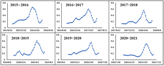 The maximum value method was used to monitor the heading stage of winter wheat in the Huang-Huai-Hai region from 2016 to 2021. Figure 4 presents the monitoring results.
