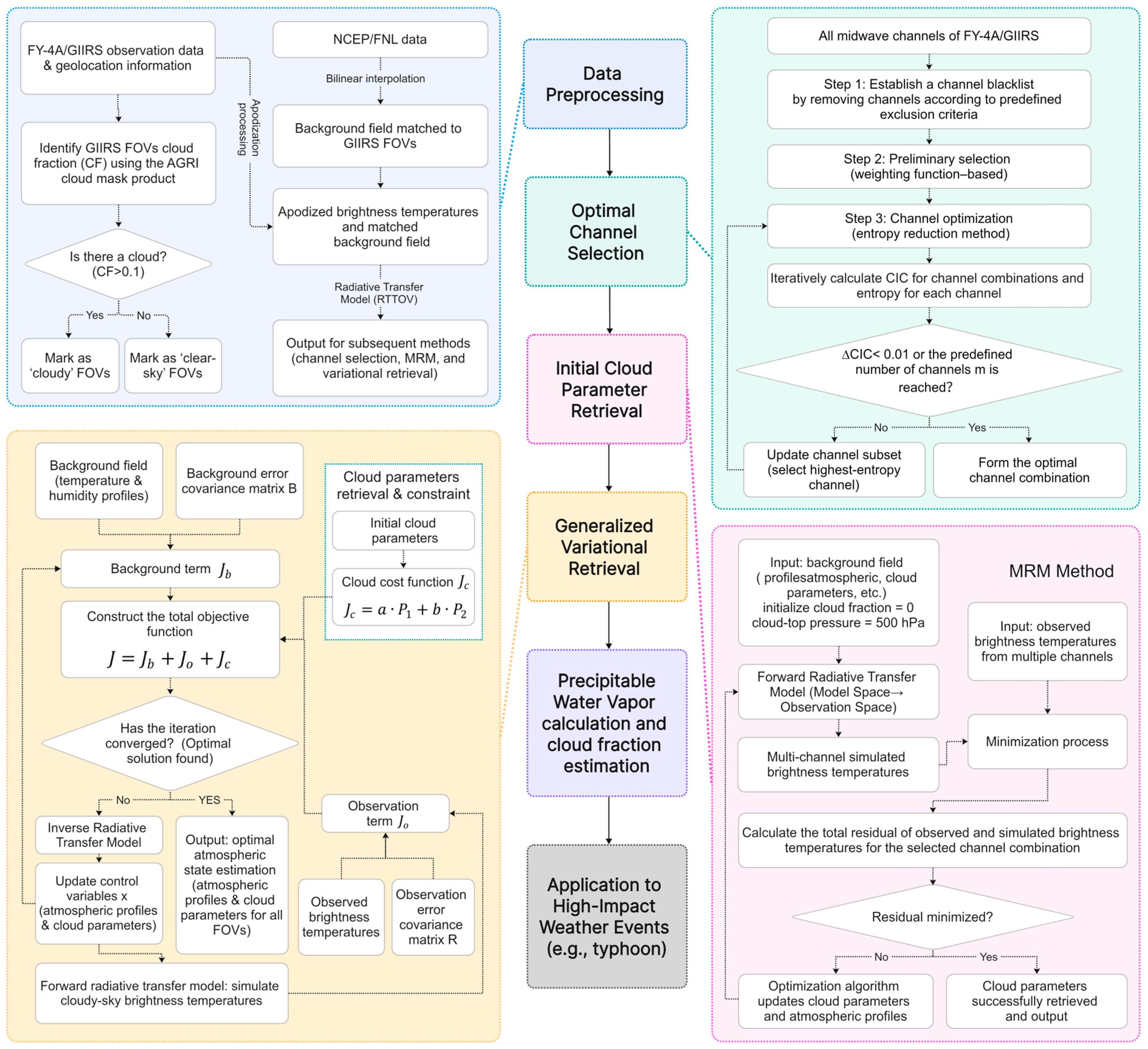 - A new generalized variational retrieval method coupled with a cloud cost function is proposed. In this method, a physical constraint term for cloud parameters is introduced into the classical variational framework [39]. This approach enables the simultaneous and synergistic retrieval of cloud fraction and atmospheric profiles for all FOV pixels and has been preliminarily and effectively applied to FY-4A/GIIRS observations in cloudy regions.