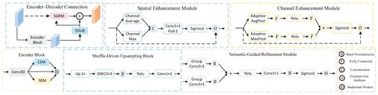 By stacking multiple 3D convolution layers, each followed by SEM and CEM, the encoder progressively captures and enhances spectral–spatial features. Specifically, SEM strengthens important spatial structures, while CEM emphasizes discriminative spectral channels. The output of the l-th encoder layer is expressed as