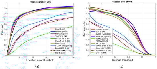 Secondly, the results in Table 10 clearly demonstrate the effect of the number of false-color images on tracking performance. In our experiments, the input consists of 16-band hyperspectral images, and each false-color image is formed by grouping three bands, which allows a maximum of five images. The configuration with five images achieves the highest performance, with an AUC of 0.572 and a DP of 0.862. Reducing the number of images to three or one results in notable performance degradation, with AUC values of 0.541 and 0.505, respectively, accompanied by corresponding decreases in DP. This indicates that increasing the number of false-color images provides more diverse feature information, thereby enhancing tracking robustness.