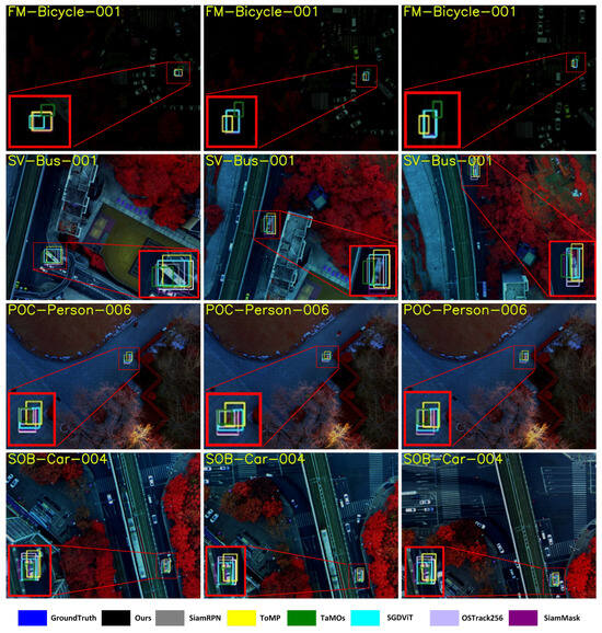 The Multispectral UAV-based Spatio-temporal Tracking Dataset (MUST) [] features eight spectral channels (390–950 nm) captured at 1280 × 960 resolution and 5 FPS. This UAV-focused dataset balances spectral richness with temporal consistency, incorporating 12 challenging attributes: partial occlusion, background clutter, low resolution, similar object interference, scale variation, motion blur, fast motion, similar color, out-of-view, illumination variation, full occlusion, and camera motion.