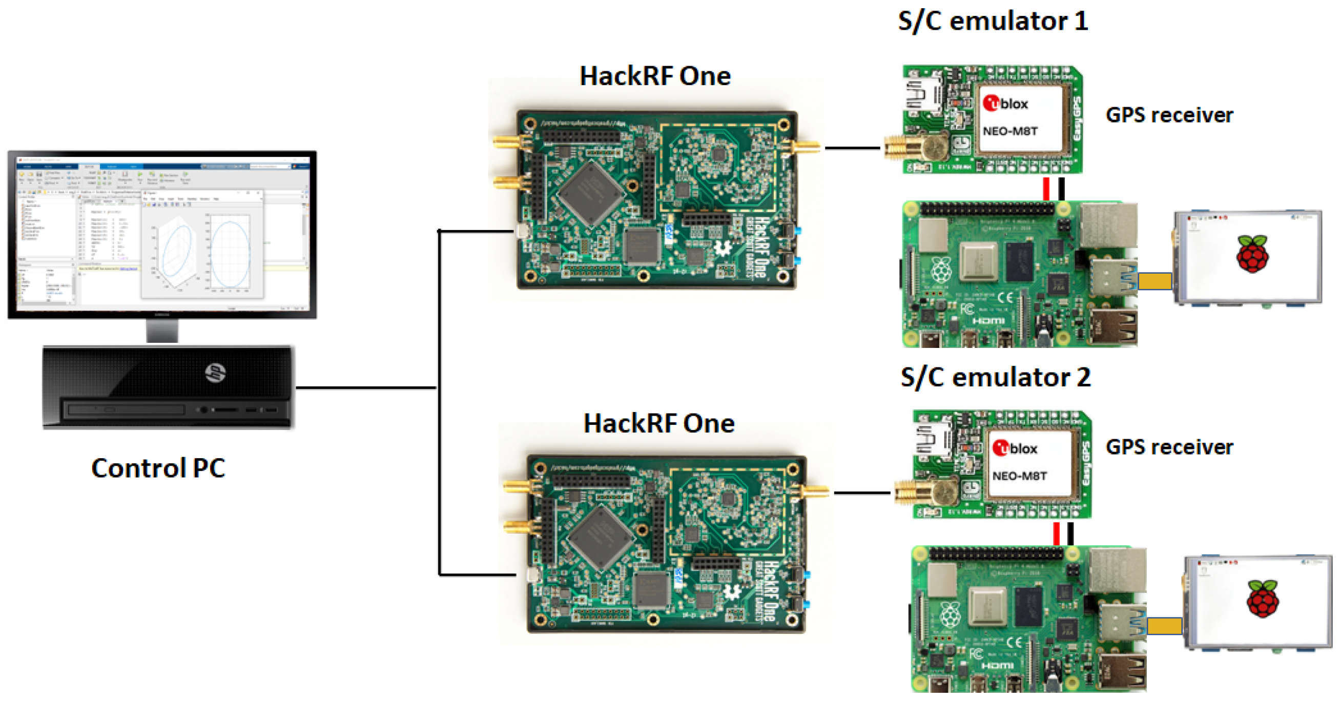 The process follows the following steps. The environment at each moment, propagates the orbits of the SCs and emulates the pseudorange signals measured by the GPS receivers of the SCs. The environment injects these signals into the antenna of the GPS receivers of the two SCs at the appropriate time. The on-board computers of the SCs read the pseudoranges measured by GPS receivers and apply the proposed algorithms. Finally, the determined positions of the SCs are compared against the propagated positions to validate the performance of the determination algorithms. The simulation period corresponds to 300 s, since we are limited by the memory of the SDR radio transmitting the GNSS signals.
