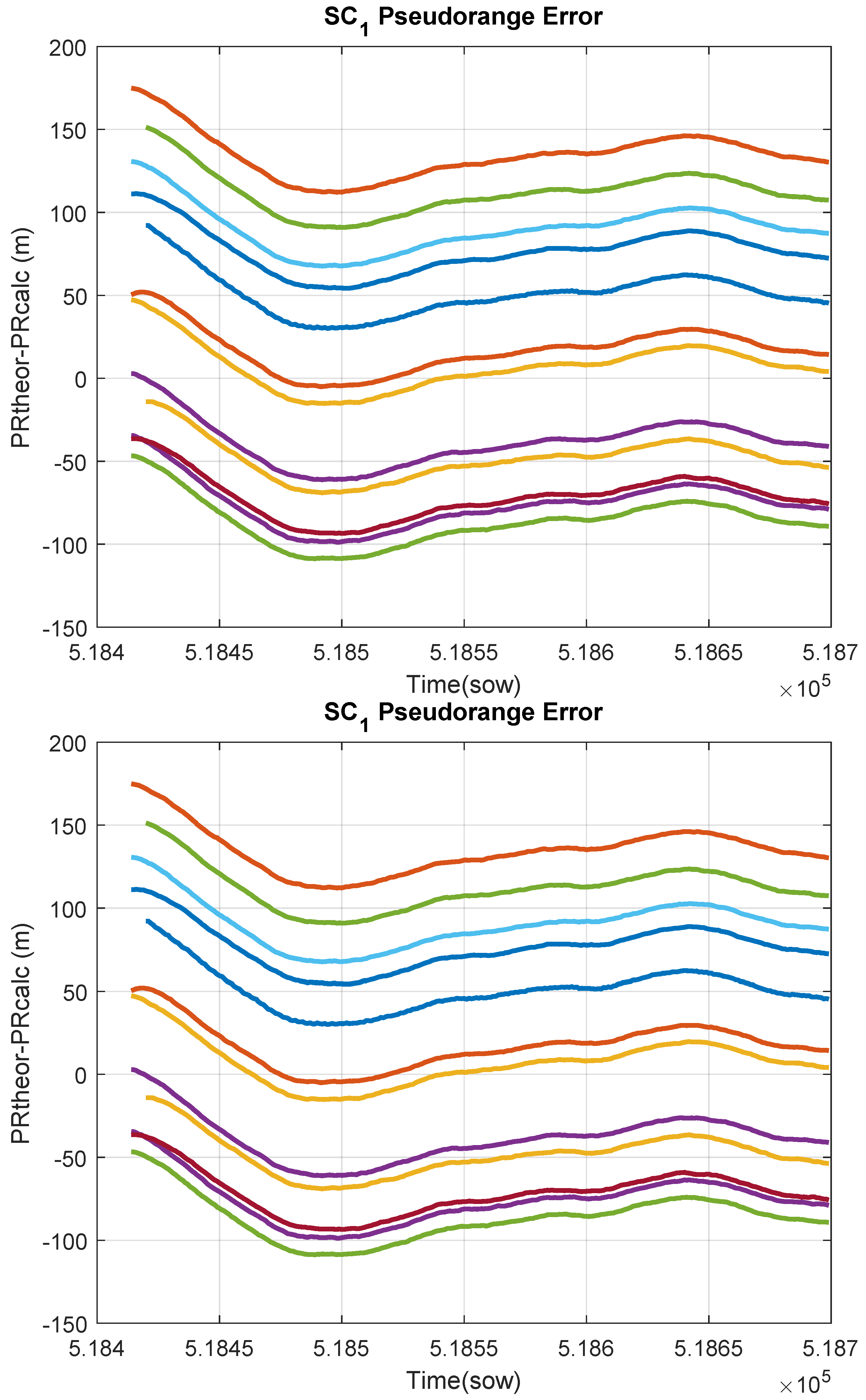 In the validation stage, low-cost GPS receivers are being used to determine the orbital position of the SCs (spacecraft). These receivers do not provide orbital position in space orbits due to the Wassenaar agreement (an international arms control arrangement [24]), but they do provide the measured pseudorange data (the calculated distance between satellites and receiver). By applying relativistic corrections (adjustments for effects due to relativity) and compensating for instrumental errors of the emitters, estimated pseudoranges are obtained, which closely resemble the theoretical values. As shown in Figure 3, the pseudorange estimation exhibits an error on the order of 100 m. These errors are acceptable for a low-cost GPS, as they correspond to a time error of 300 ns (nanoseconds), which represents a demanding temporal resolution for digital instrumentation.